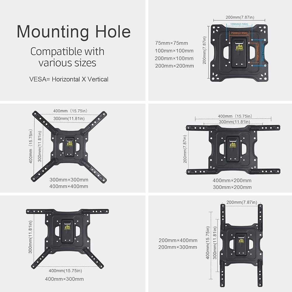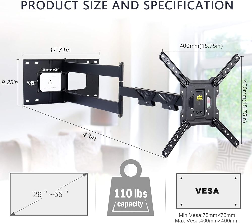 حامل حائط للتلفزيون/الشاشة بطول 43 بوصة: يناسب معظم أجهزة التلفاز والشاشات LCD LED LED المسطحة/المنحنية مقاس 22 بوصة - 55 بوصة، وأنماط VESA من 75 × 75 مم حتى 400 × 400 مم، ويزن ما يصل إلى 110 رطل