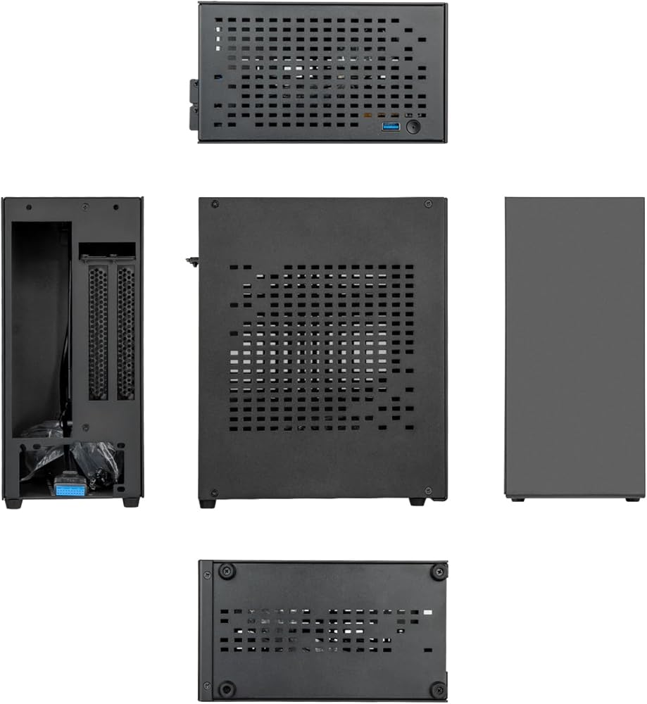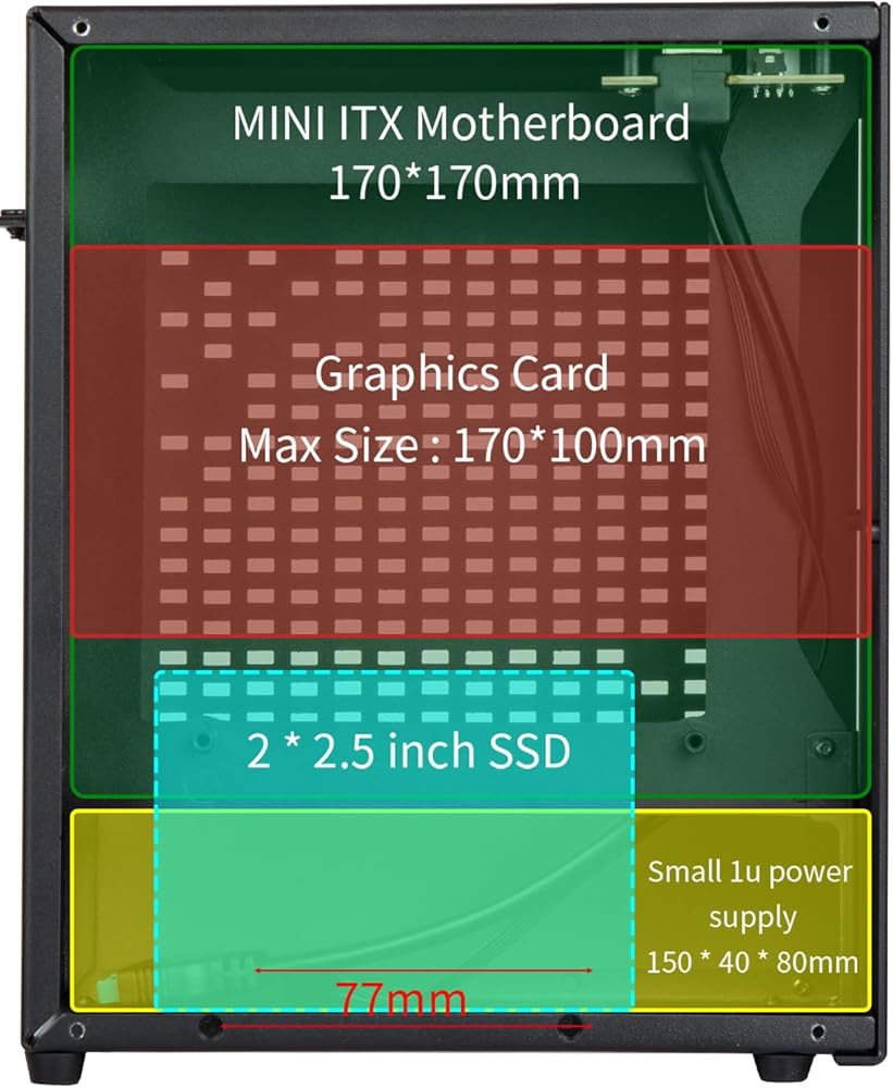 【Compatibility Accessories】Support Standard ITX Motherboard(17x17cm), FLEX-Small 1U Power Supply (15*4*8cm), Graphics Card (17*10*4cm), Hard Disk(2x2.5inch SSD, thickness less than 9mm), CPU Cooler(Less than 36mm)