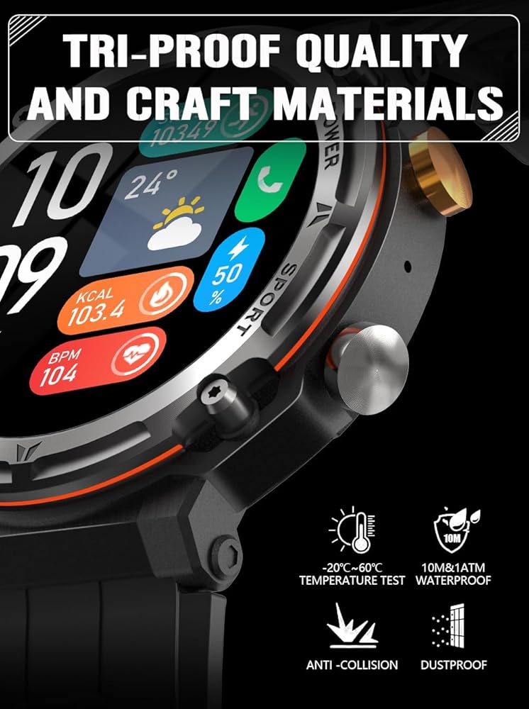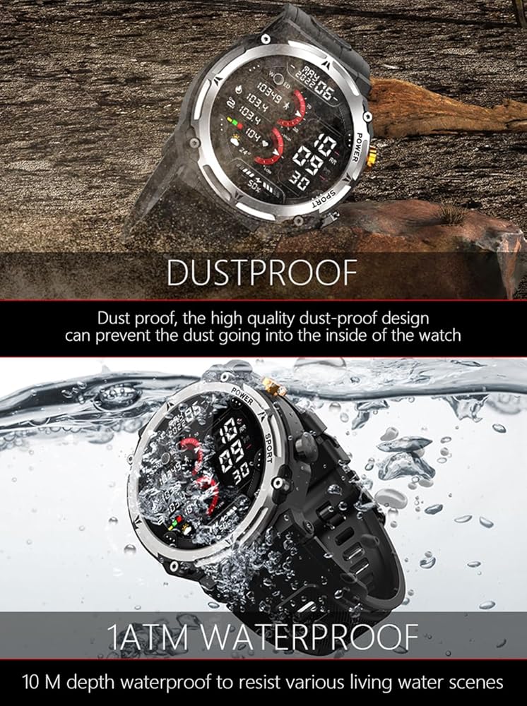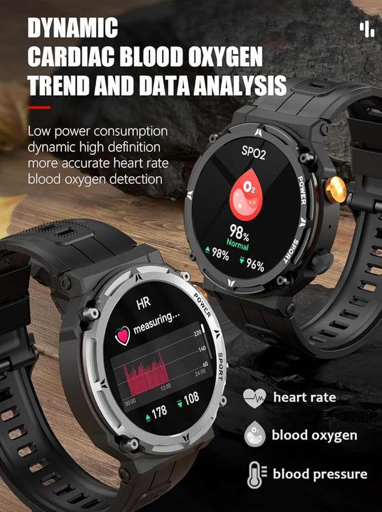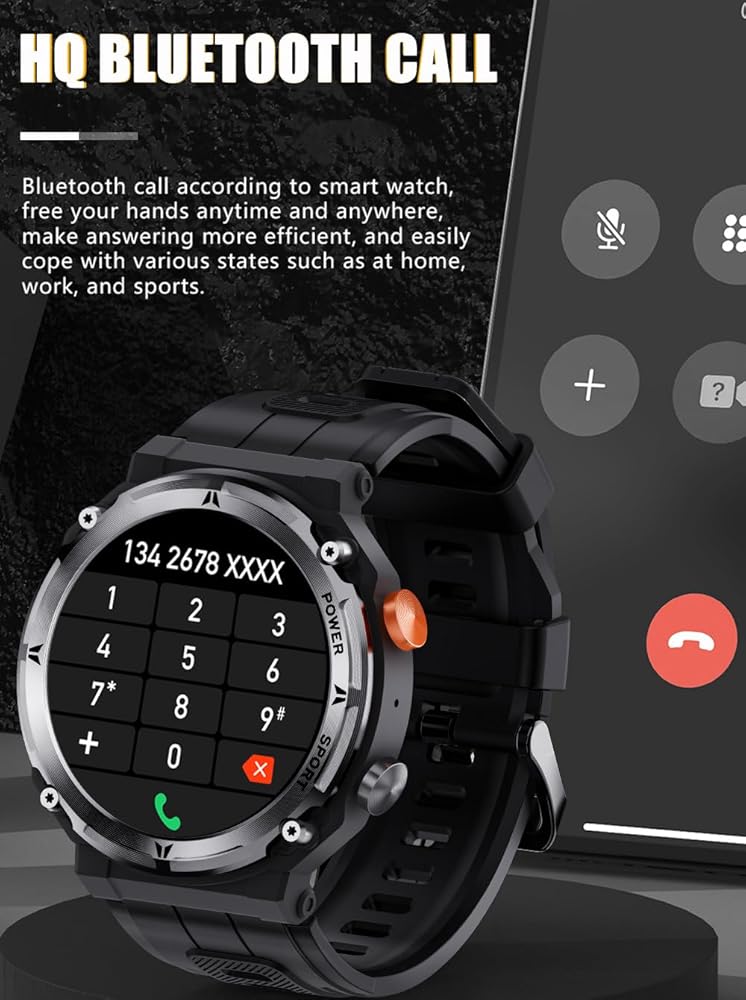 • Military Smart Watch for Men: 1.39 inch large color screen, even in strong sunlight, the screen is very clear and bright, enough to see clearly. Aviation aluminum material, resistant to shock, low and high temperature; precision soldering protects the smart watch from dust entry. Hard protective case and rugged appearance style is perfect for outdoor activities enthusiast.