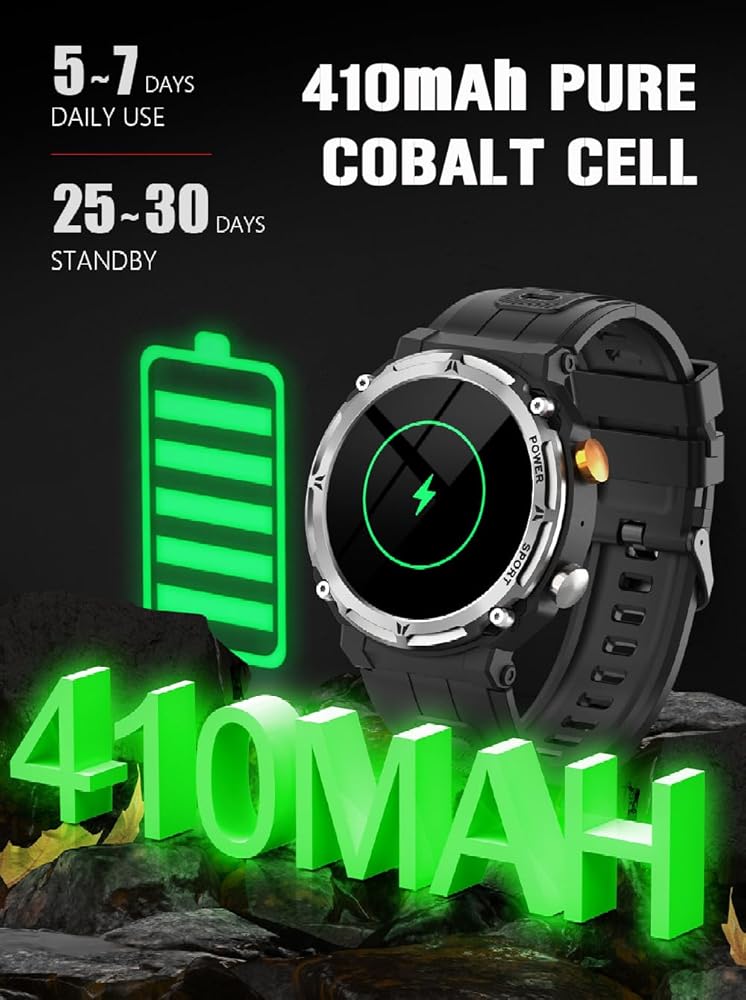 ساعات ذكية عسكرية للرجال بقدرة 410 مللي أمبير في الساعة في وضع الاستعداد الطويل، ساعة ضغط الدم التكتيكية لإجراء المكالمات/الرد على المكالمات، معدل ضربات القلب/مراقبة الأكسجين في الدم، ساعة تتبع اللياقة البدنية متوافقة مع هواتف Android iOS