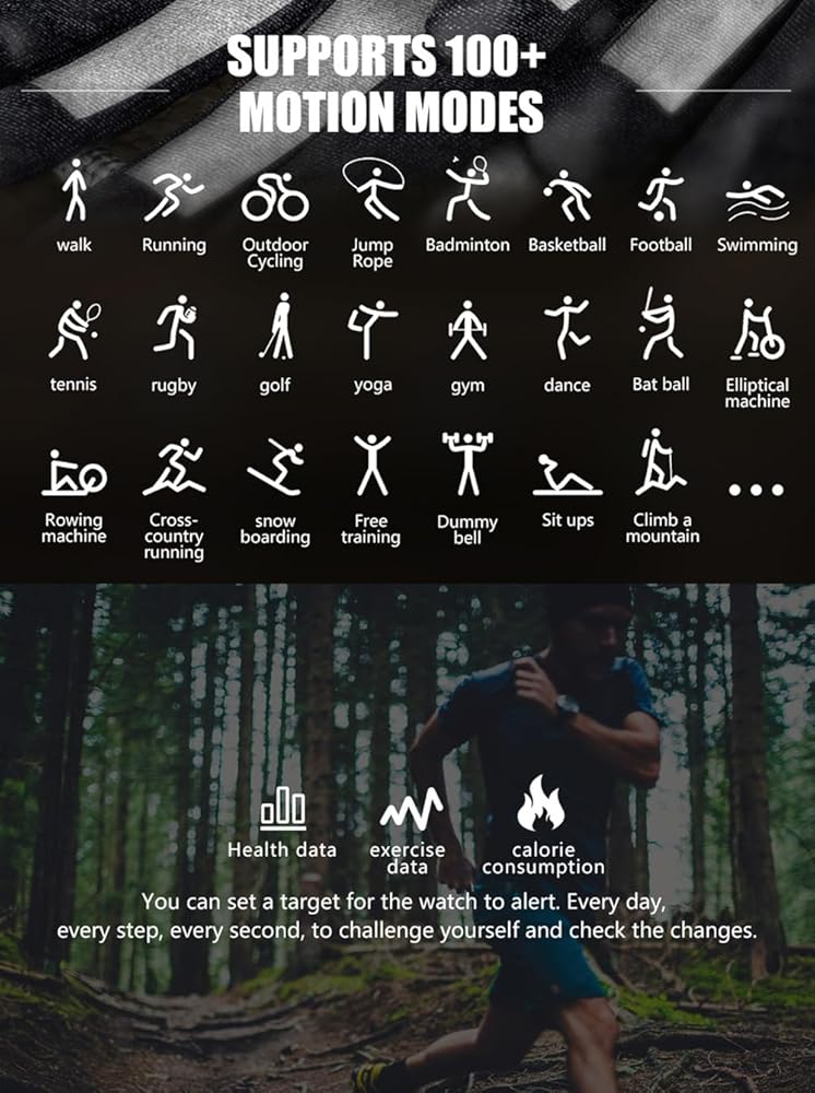 • Various Sports Modes: 100+ Out-/indoor sport modes are offered to meet much of the demands of fitness group. The smart watch also features calculation of calorie burned and sport distance and more exercise data in multi-sport modes, fitness tracker, activity tracker, pedometer, stopwatch and more functions waiting for your exploration.