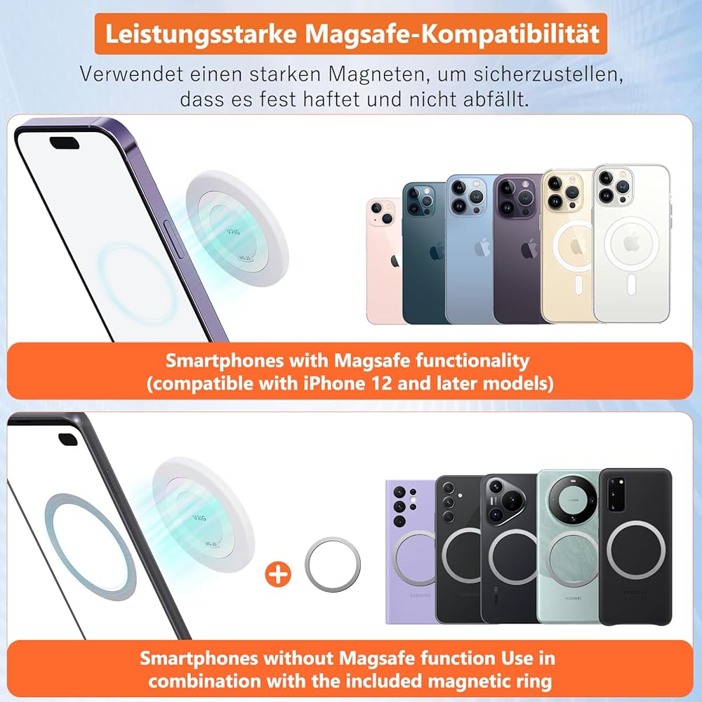 【متوافق مع】متوافق خصيصًا مع سلسلة الهواتف 15/14/13/12 بدون/مع حافظة مغناطيسية (كل من الحافظة الرسمية وحافظة الطرف الثالث مع معدن مغناطيسي مدمج)، تتضمن العبوة حلقة معدنية مغناطيسية تناسب الهواتف غير المغناطيسية وأجهزة Android الأخرى هاتف.