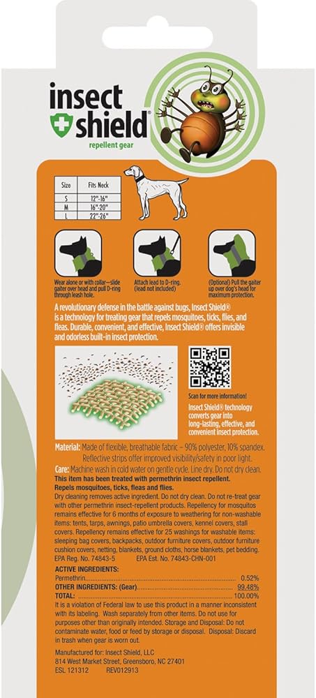 Insect Shield Repellent Gear is designed for indoor or outdoor use and is used to repel mosquitoes, ticks, fleas, and flies. The active ingredient in Insect Shield is permethrin. The formula used is tightly bound to fabric fibers and offers effective, odorless, built-in insect protection. The neck gaiter can be worn around the neck or up over the head for maximum protection. It is made of a flexible, breathable, machine-washable fabric that will not irritate your dog's skin. Insect Shield Neck Gaiters Made of stretchy, breathable fabric that can be worn around the neck or over the head, Insect Shield Neck Gaiters can be worn with other Insect Shield apparel items for maximum protection against harmful biting insects! Neck Gaiters are treated with state-of-the-art Insect Shield technology, converting them into long-lasting, convenient, and effective insect protection Effectively repels ticks, mosquitoes, and other biting insects. Made of stretchy, breathable fabric that can be worn around the neck or over the head. Features reflective strips to promote visibility and safety in low light, and a leash hole for added convenience For built-in insect protection for your pet, check out our entire line of Insect Shield products! Each is packaged for retail. Material: 90% polyester, 10% spandex Care: Machine wash in cold water on gentle cycle. Line dry. Caution: Do not re-treat with other permethrin insect repellent products. Colors:. Fern. Carrot Sizes:. Small measures 7"L x 6"W and adjusts to fit necks 12"–16". Medium measures 9"L x 8"W and adjusts to fit necks 16"–20". Large measures 12"L x 11"W and adjusts to fit necks 22"–26"
