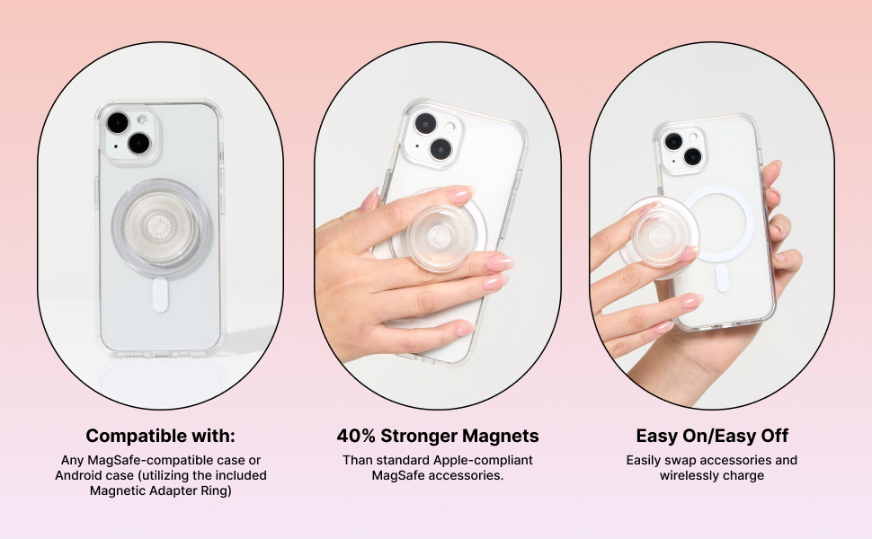 • Our circular phone grip compatible with MagSafe we call a "PopGrip" securely attaches to your MagSafe-compatible case for maximum grip and kickstand capabilities