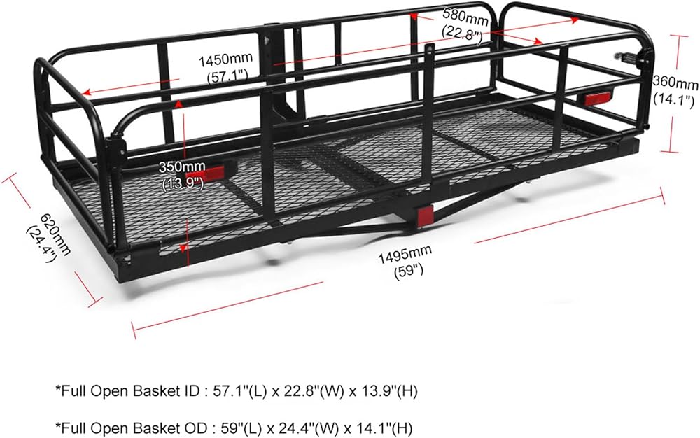 مصنوعة من الفولاذ عالي التحمل مع طلاء مضاد للصدأ. تبلغ أبعاد سلة البضائع 59 بوصة طولًا × 24.4 بوصة عرضًا × 14.1 بوصة طولًا ولها القدرة على تحمل ما يصل إلى 500 رطل ضخم