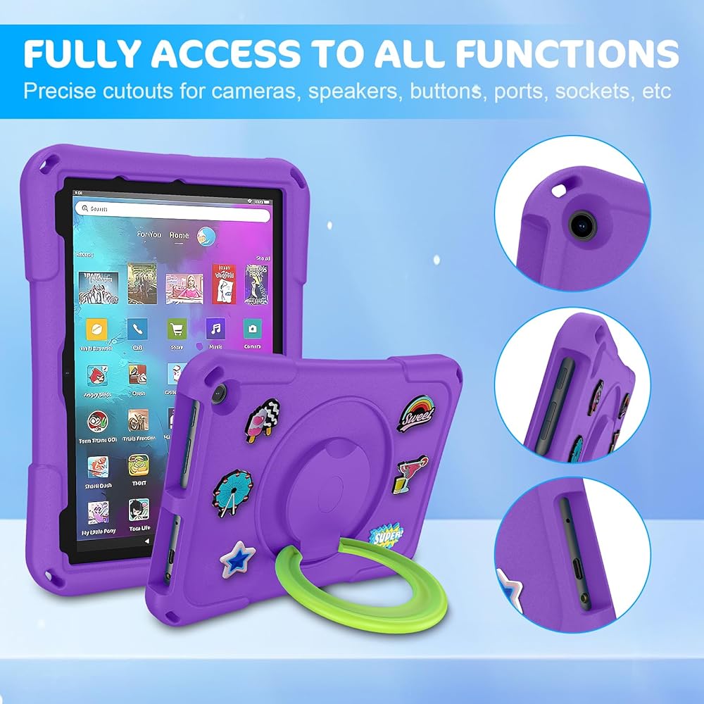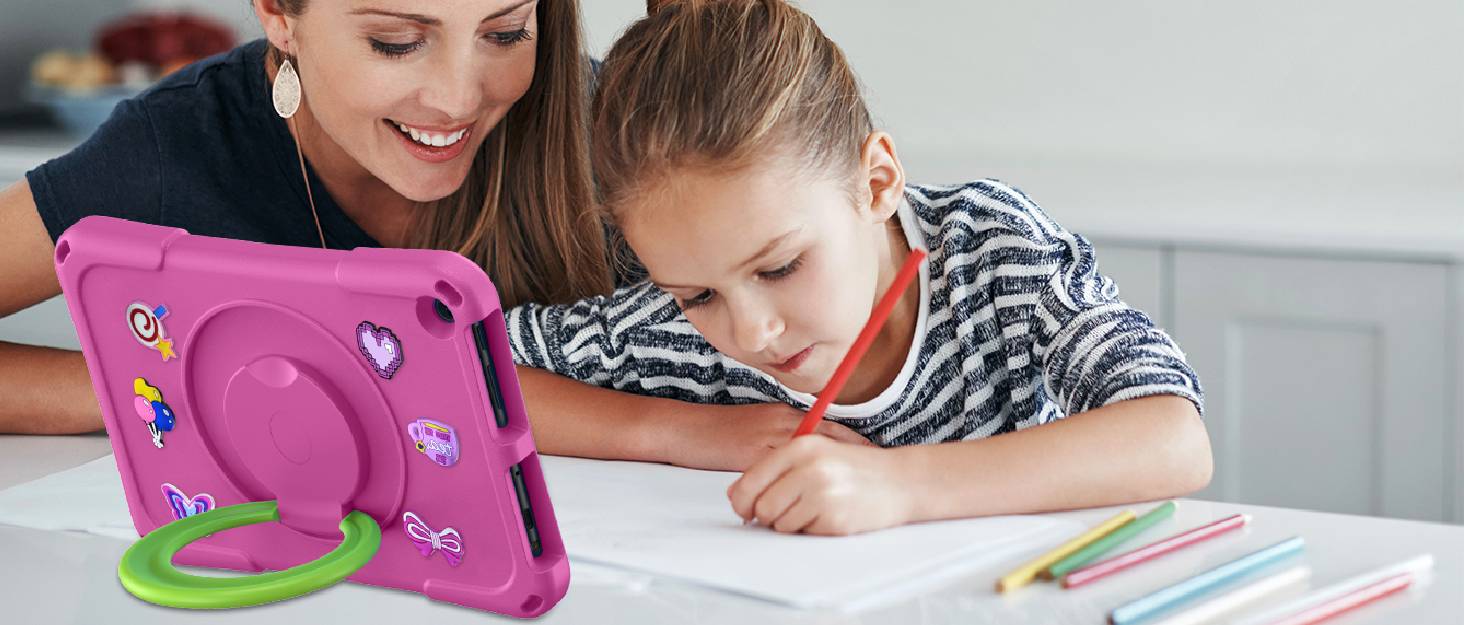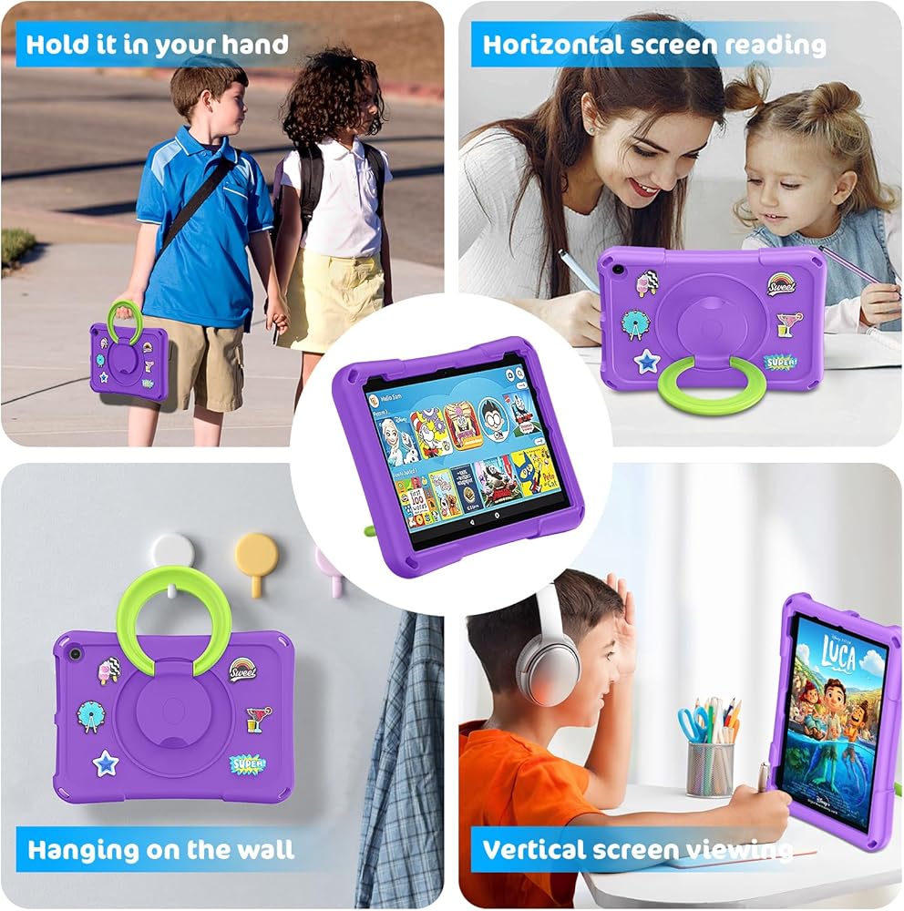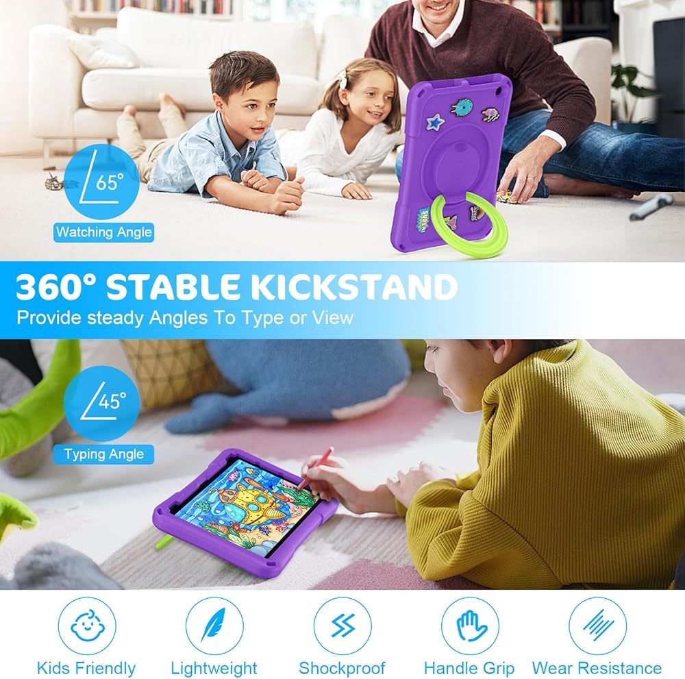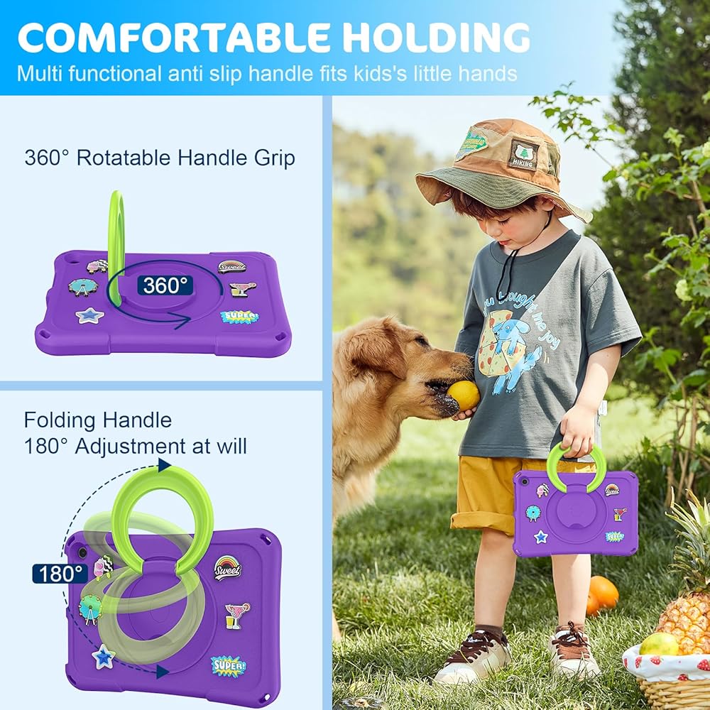 3. The built-in 360 degree rotatable ring bracket can support your tablet in a horizontal or vertical position. 10 inch tablet case for kids can also be made into a handle for easy portability.