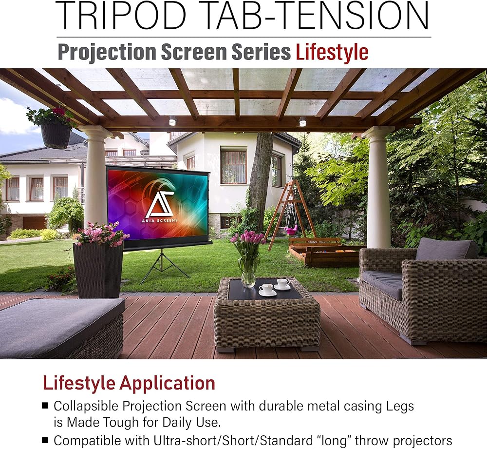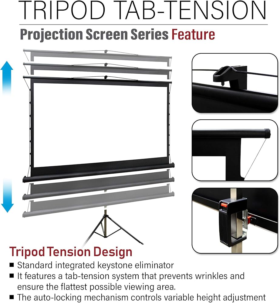 【أداة ضبط القفل سهلة النقر】- توفر نطاقًا متعدد الاستخدامات من إعدادات الارتفاع مما يسمح بعدد كبير من إمكانيات نسبة العرض إلى الارتفاع. يوفر Keystone Eliminator المرونة في تصحيح تشويه الصورة الناتج عن زوايا العرض. شاشة عرض محمولة مع حامل ثلاثي القوائم قابل للطي.