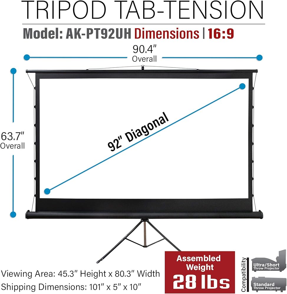 【دقة فائقة الوضوح وحجم عرض واسع】- هذا مثالي للعروض التقديمية المحمولة باستخدام أجهزة العرض القياسية إلى القصيرة جدًا. توفر هذه الشاشة إعدادًا سريعًا وهي مثالية لبيئات الإضاءة التي يمكن التحكم فيها في القطاع التعليمي أو مع العروض التقديمية للأعمال. شاشة عرض Tab Tension متوافقة مع 4K Ultra HD وActive 3D Projection Ready. زاوية عرض 180 درجة. 92 بوصة قطريًا، نسبة العرض إلى الارتفاع 16:9. حجم العرض: 45.1 بوصة ارتفاع × 80.2 بوصة عرض.