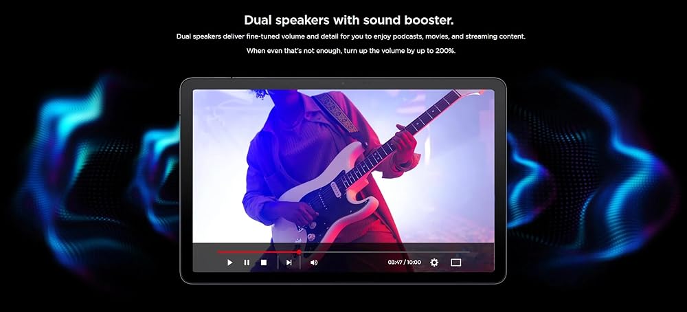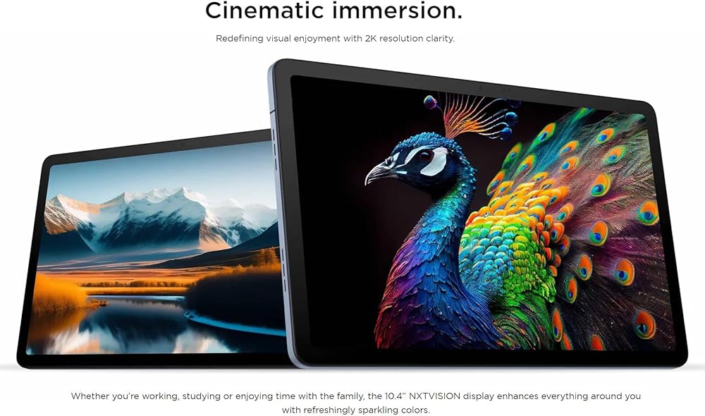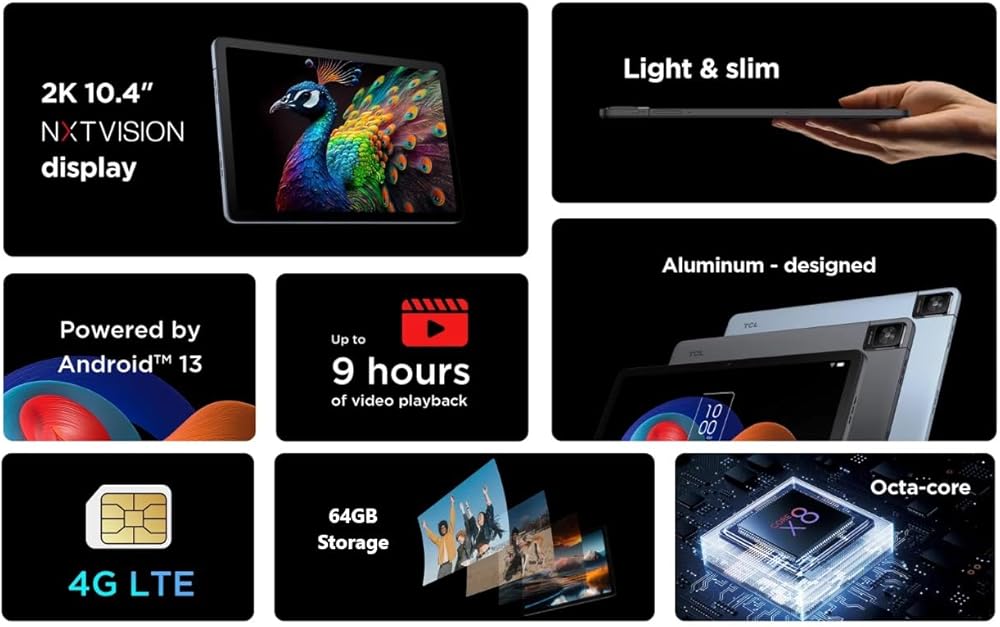 Built to last. Designed elegantly. Comfy to carry and hold in one hand, the aluminum design is light and yet solid, ensuring longer durability with a sleek appearance. Aluminum design. Giving a premium feel and look while preventing careless bumps, drops, and smudges. Cinematic immersion. Redefining visual enjoyment with 2K resolution clarity. Whether you're working, studying or enjoying time with the family, the 10.4” NXTVISION display enhances everything around you with refreshingly sparkling colors. Expansive screen viewing. Smoothly narrowed bezels increase the feeling of immersion. Dual speakers with sound booster. Dual speakers deliver fine-tuned volume and detail for you to enjoy podcasts, movies, and streaming content. When even that's not enough, turn up the volume by up to 200%. Powered by Android 13: Enjoy all your favorite apps with all the latest features regularly maintained with security updates. Power throughout the day. Worry less about the remaining battery power. Focus more on what you want to do. 64GB ROM. Massive memory. Ample storage for everything you need. Expand up to 1TB with a microSD card. High-performance. Power-efficiency. Power-hungry apps launch faster. Less lagging while streaming HD content. Call anywhere. Anytime. 4G LTE connectivity. Fewer disruptions and unwanted delays with a built-in 4G LTE chipset that provides personal hotspots, making you less reliant on public Wi-Fi outside the home. Intelligent screen with seamless TCL UI. Mirror casting mode Project what's on your screen. Ideal for watching movies, streaming or studying presentation slides. Screen extension mode. Give yourself more space to work faster and multi-task more easily.