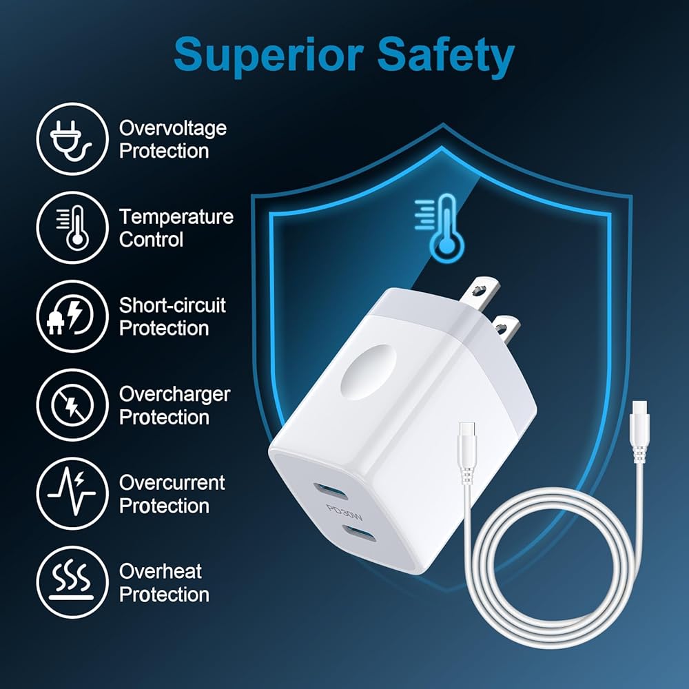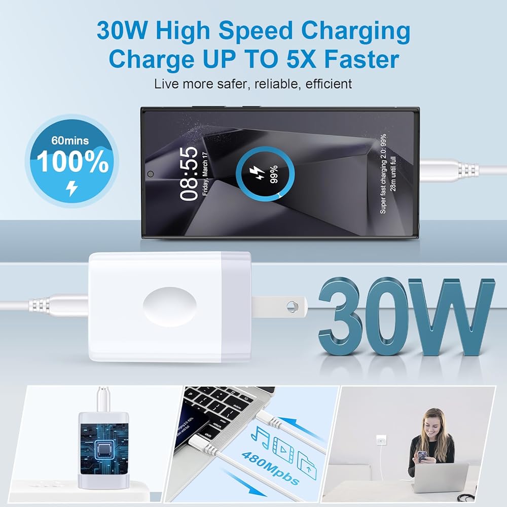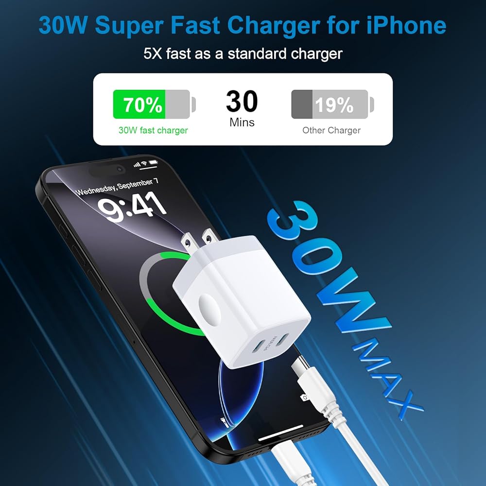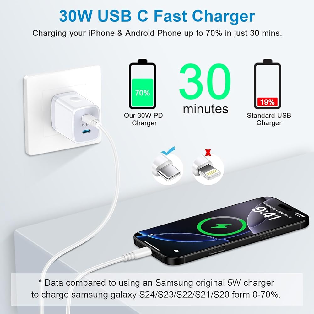 ✔30W Super Fast charger delivers up to 3 Amp to charge your phones from 0 to 70% in just 30 mins,5 times as fast as a standard USB C wall charger