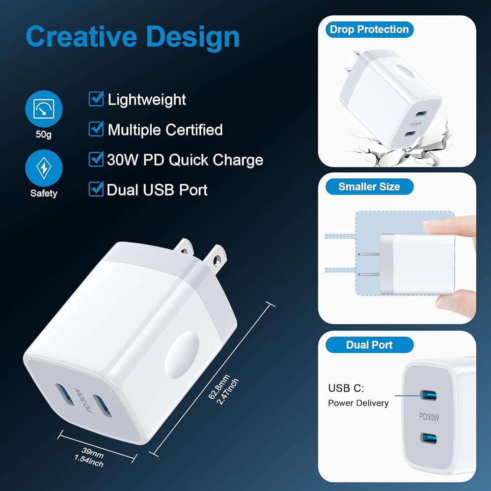 30W USB C Charger Brick Box Cube Plug Dual Port Fast Charging Block