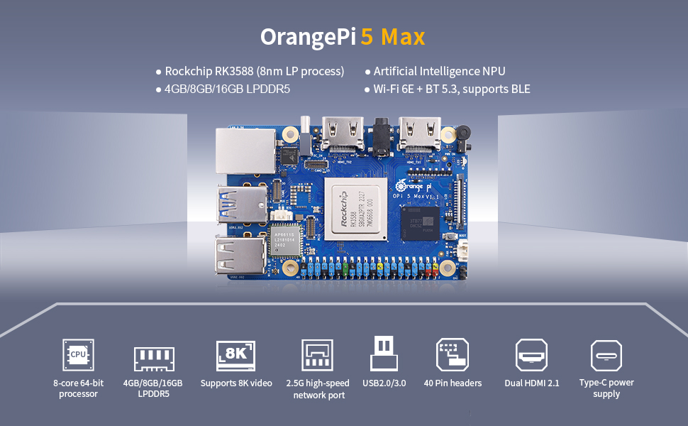 🍊[وحدة NPU للذكاء الاصطناعي الفعال]: مجهزة بوحدة NPU 6TOPS مدمجة، وهي تدعم الحوسبة الهجينة INT4/INT8/INT16، مما يجعلها مثالية لتطوير تطبيقات الذكاء الاصطناعي. سواء كان الأمر يتعلق بالتعرف على الصور، أو معالجة اللغة الطبيعية، أو التعلم الآلي، فإن هذه اللوحة توفر دعمًا قويًا.