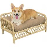 This rattan dog daybed is made of natural-color woven rattan and is decked out with a beige cushion