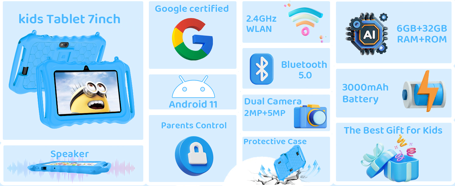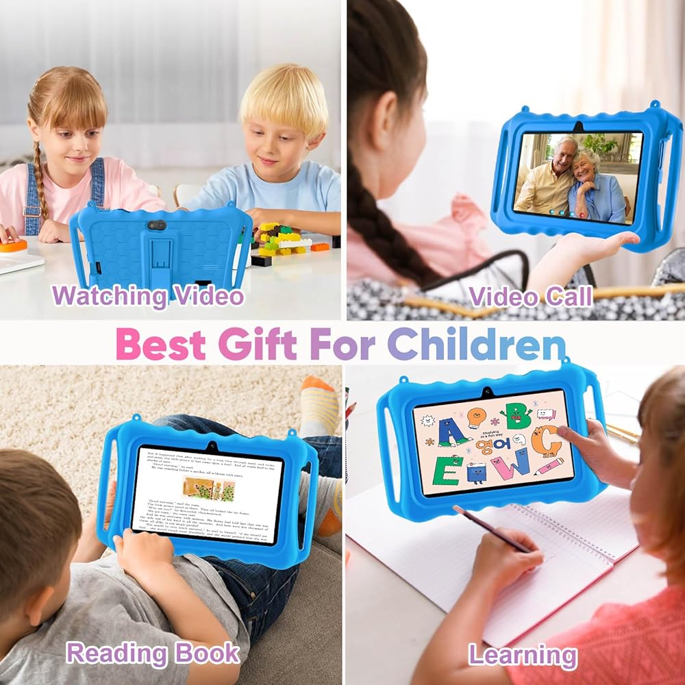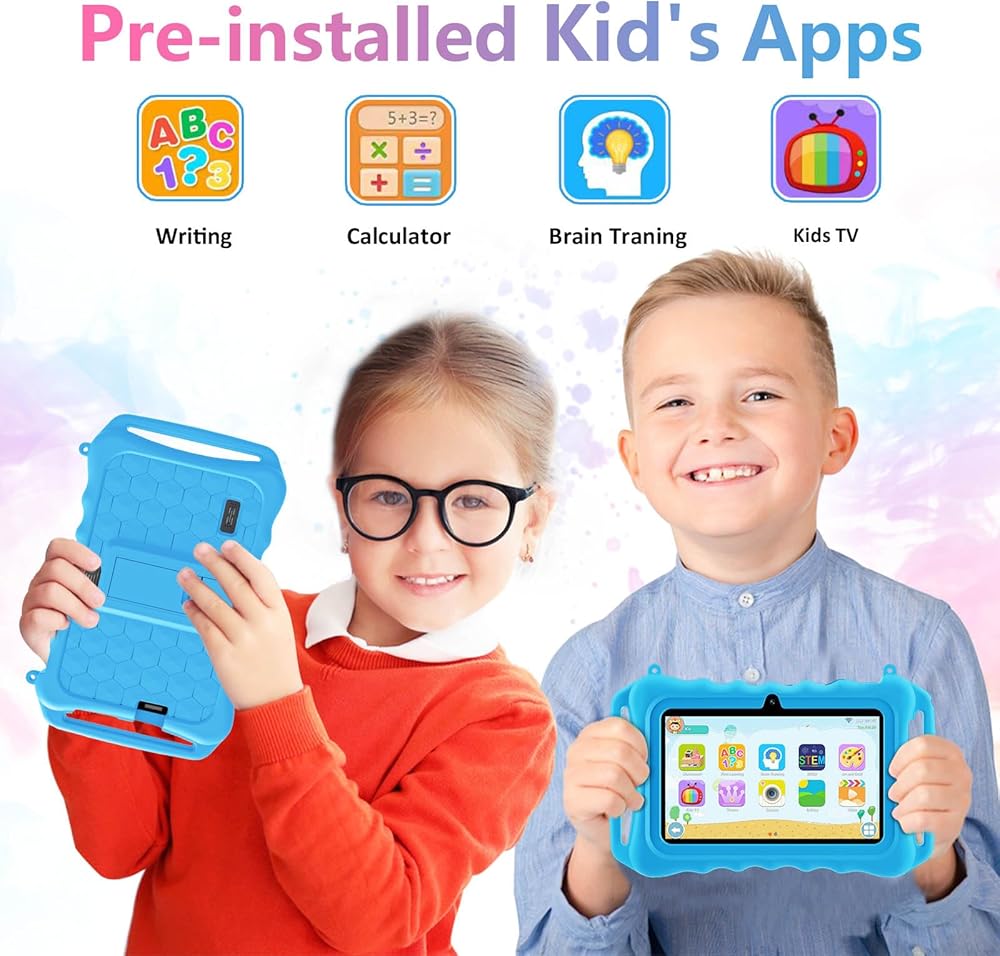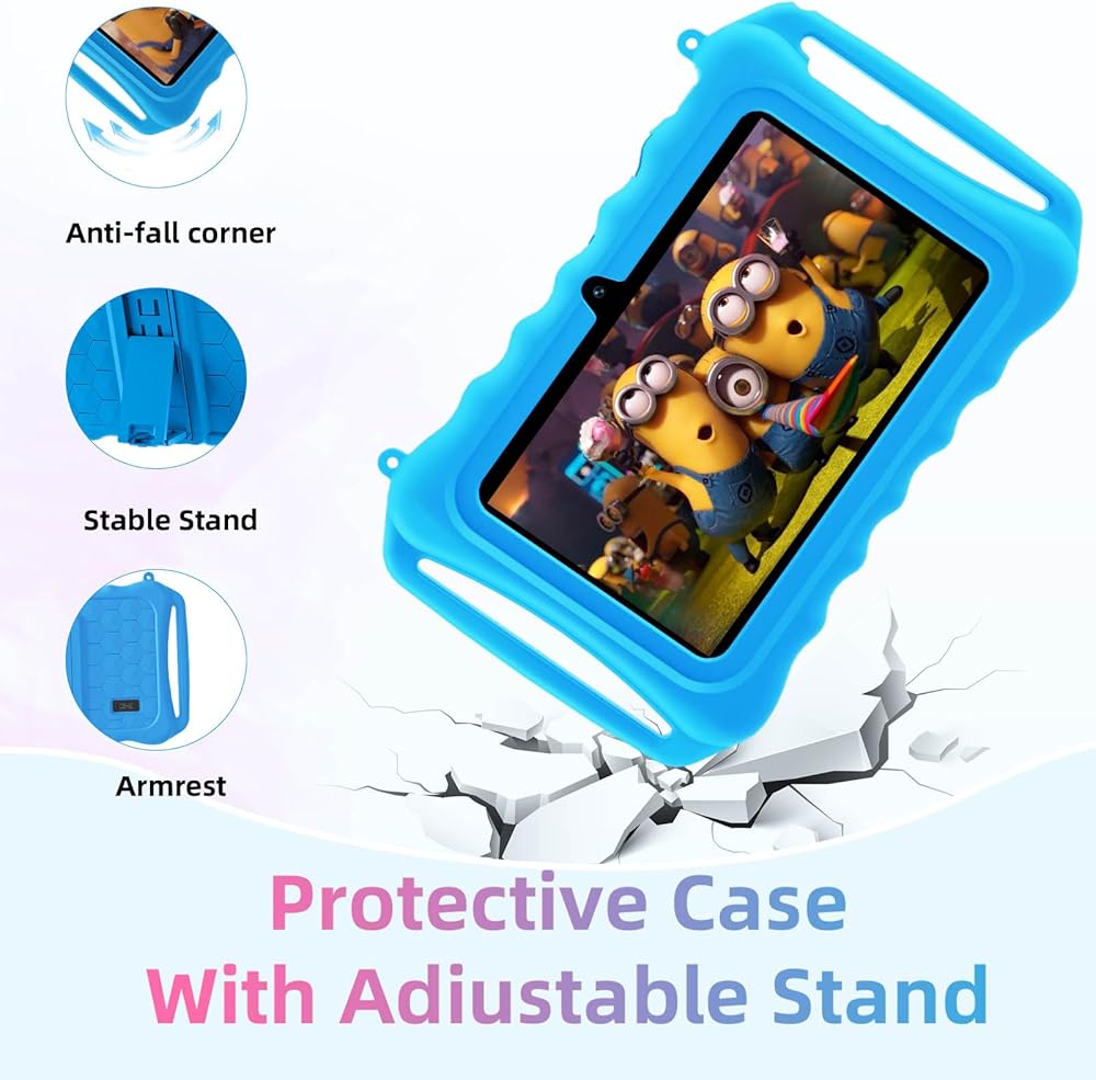 جهاز لوحي للأطفال عالي الأداء: جهاز لوحي للأطفال مدمج بمعالج رباعي النواة قوي معتمد من GMS، وأحدث نظام Android 11، وشاشة لمس عالية الدقة 1024x600 IPS، وذاكرة وصول عشوائي 2 جيجابايت، وذاكرة تخزين داخلية 32 جيجابايت (قابلة للتوسيع حتى 512 جيجابايت) تتعامل بسهولة مع مهام متعددة، هذا الطفل الصغير يوفر الجهاز اللوحي مساحة كبيرة لتنزيل الألعاب والموسيقى ومقاطع الفيديو.