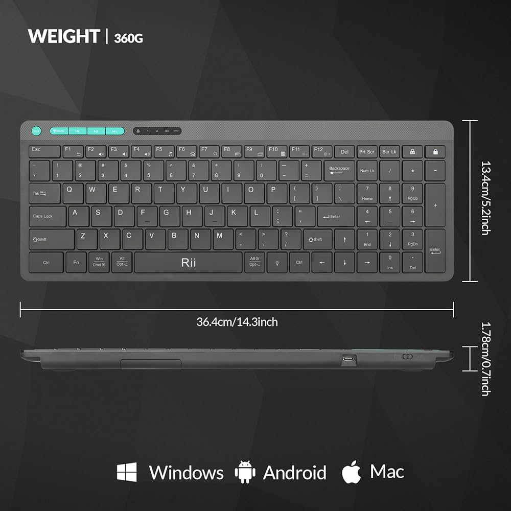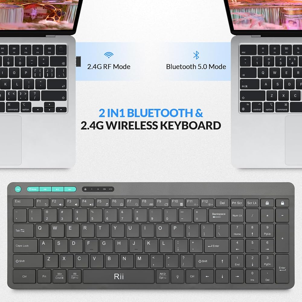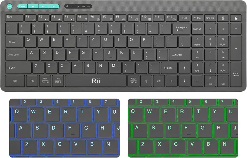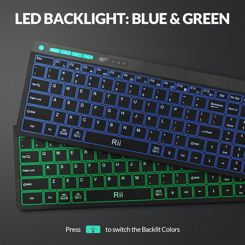 لوحة مفاتيح بلوتوث Rii، لوحة مفاتيح لاسلكية بلوتوث 5.1، لوحة مفاتيح بإضاءة خلفية مزدوجة الطراز، لوحة مفاتيح قابلة لإعادة الشحن مع لوحة أرقام، لوحة مفاتيح مدمجة لأجهزة iPad والكمبيوتر اللوحي والكمبيوتر الشخصي والكمبيوتر المحمول (أسود)