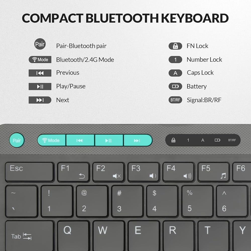 • 【لوحة مفاتيح مزدوجة الوضع】لوحة مفاتيح لاسلكية مع أوضاع بلوتوث 5.1 +2.4G وزر مفتاح واحد للتحكم في الاتصالين. يمكن للوحة المفاتيح توصيل جهاز واحد من خلال البلوتوث وجهاز آخر من خلال جهاز استقبال USB بسرعة 2.4 جيجا هرتز. مسافة الاتصال تصل إلى 10 م. مع مفاتيح QWERTY بالحجم الكامل ولوحة الأرقام.