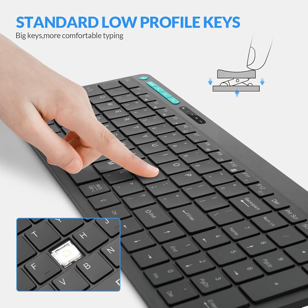 • 【كتابة على شكل كمبيوتر محمول منخفض المستوى】لوحة مفاتيح مزودة بآلية مفتاح مقص، فهي تعزز ردود الفعل والثبات. إن حركة المفاتيح المُحسّنة تجعل الكتابة أكثر راحة ودقة.