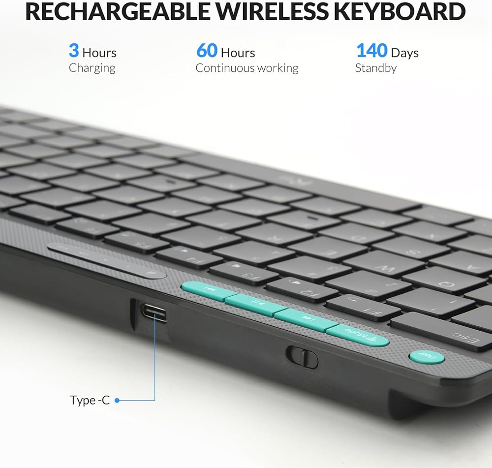 • 【لوحة مفاتيح قابلة لإعادة الشحن 】لوحة مفاتيح بلوتوث مع بطارية قابلة لإعادة الشحن لمناصري الاستدامة البيئية. يمكن أن يستمر لمدة 60 ساعة من العمل المستمر، و140 يومًا في وضع الاستعداد. خاصية توفير الطاقة المميزة تجعل لوحة المفاتيح تدخل في وضع السكون بعد 10 دقائق من الدخول