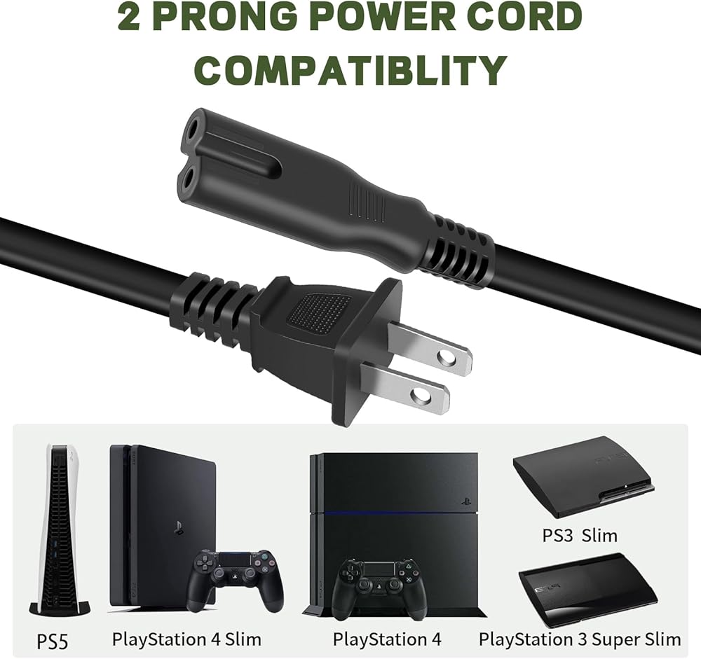 سلك طاقة تيار متردد يناسب أجهزة PS5/PS4/PS4 Slim/PS3 Slim/PS3 Super Slim، وحدة تحكم PlayStation 5 PlayStation 4/3 Slim، Xbox Series S/X، Xbox One S/X، استبدال كابل الطاقة بفتحتين