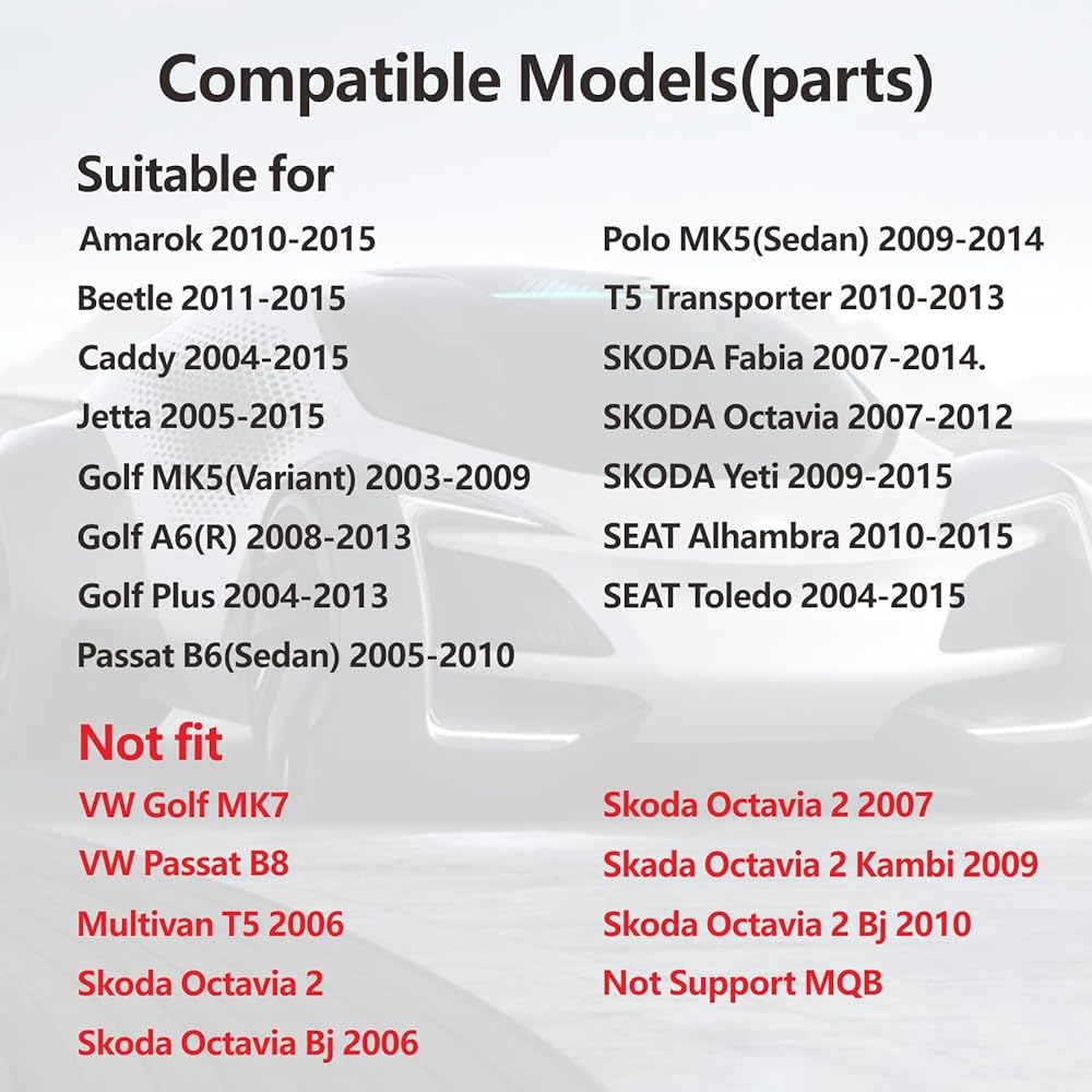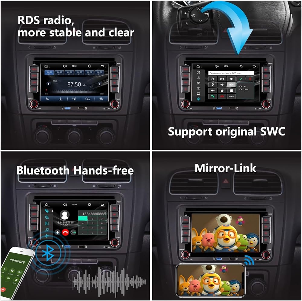 • 【راديو سيارة مزدوج DIN لشركة فولكس فاجن】تم تصميم شاشة ستيريو السيارة المزدوجة هذه خصيصًا لشركة فولكس فاجن. الموديلات القابلة للتطبيق هي: Caddy، Jetta، Golf، Passat، Polo، SKODA، SEAT، إلخ. يمكنك الرجوع إلى صورة توافق السيارة، كما يتم وضع علامة على الطرازات غير المتوافقة. مقاس الراديو هو: 220 مم*130 مم، يرجى التأكد من المقاس قبل الشراء.