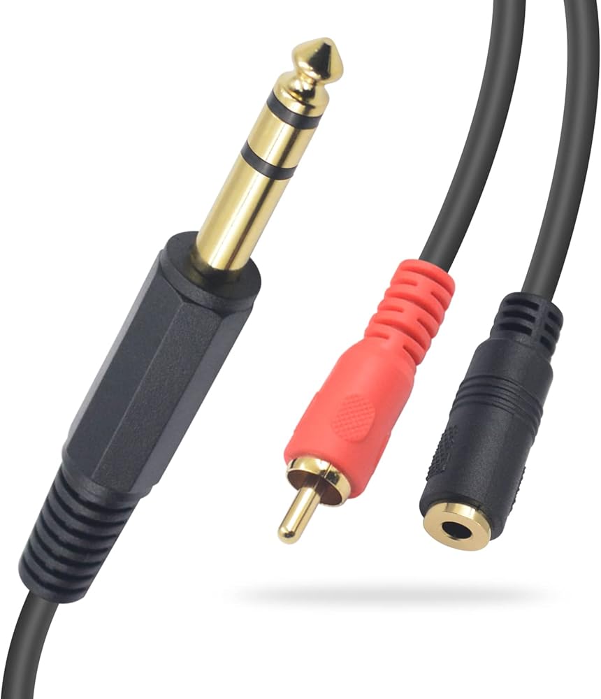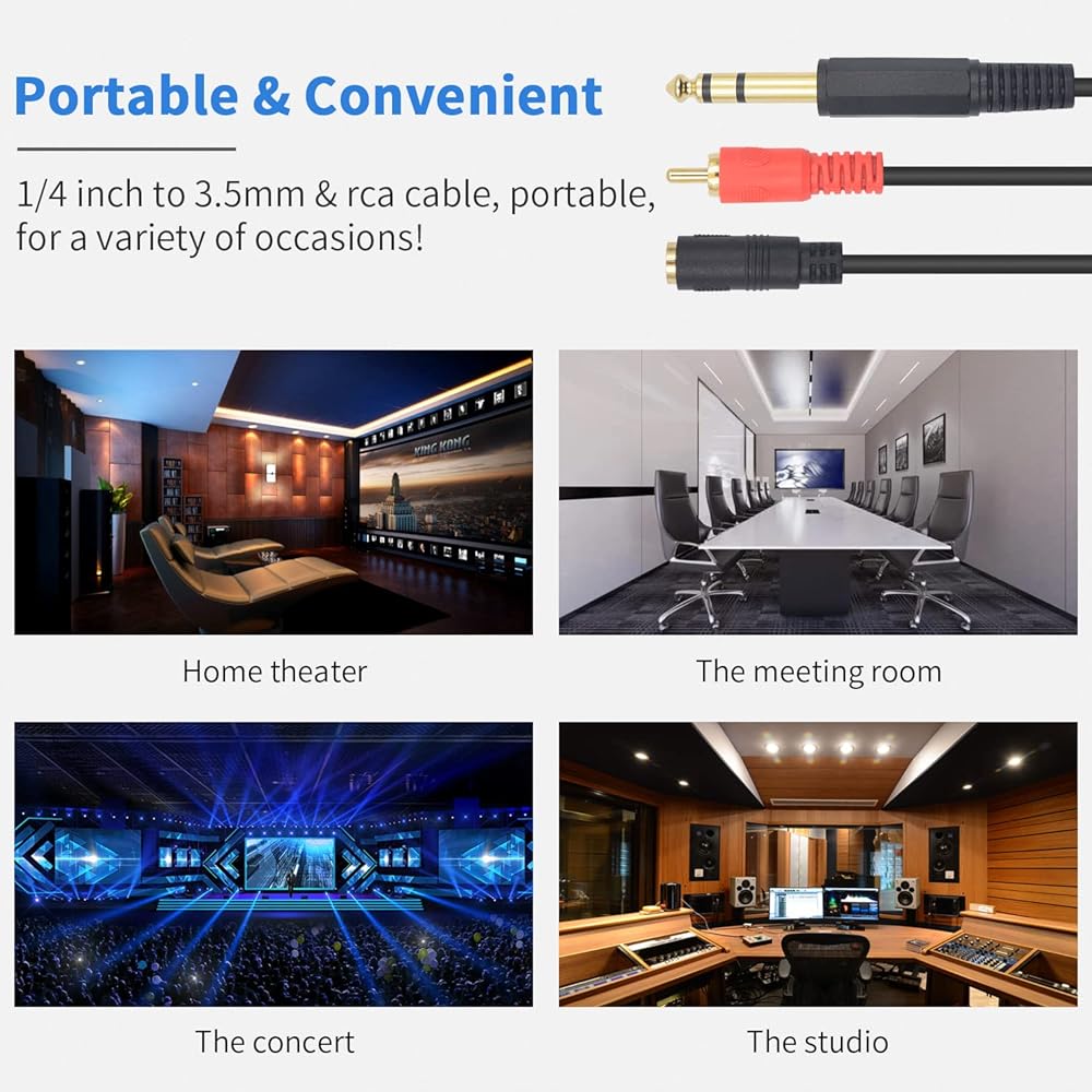 قابس 6.35 مم إلى 3.5 مم وكابل توصيل 6.35 مم إلى RCA: يدعم نقل أجهزة التوصيل المتعددة، ويسمح بالاتصال المحكم بين منفذ 3.5 مم (1/8 بوصة) ومنفذ 6.35 مم (1/4 بوصة)، ويعمل أيضًا لتوصيل ستيريو 6.35 ملم إلى RCA لعرض الصوت.
