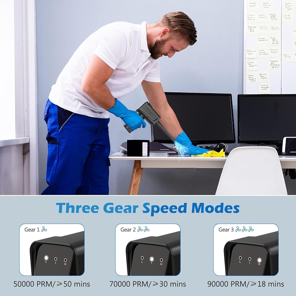 3 Speed Modes Keyboard cleaner - Cordless air duster Blowing force 1.86-2.75OZ, with 3 Powerful Speed Modes( slowest speed - 50000RPM, medium - 70000RPM, strongest speed - 90000 RPM),continuously provide high pressure air to remove dust, can produce super strong airflow. Remove debris and dust from any devices in your home, office or car.