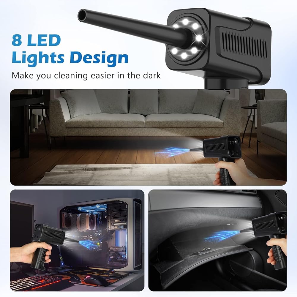 8 LED Lights & Cordless Air Duster - LED lights automatically illuminate when turned on cordless air duster, 8 LED Lights allowing you to easily clean up dark corners,cordless design, it's comfortable to use, and easy to carry around.