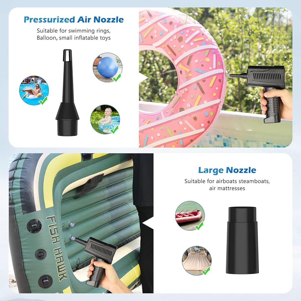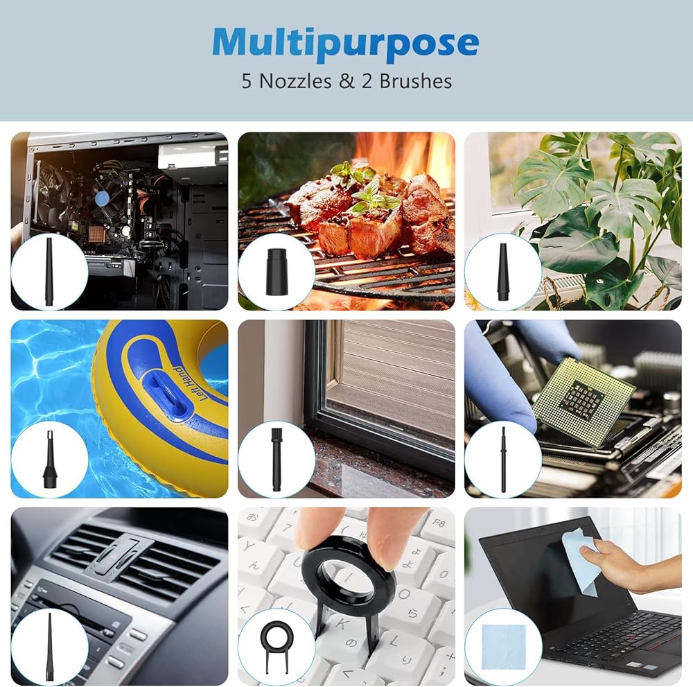 7 IN 1 Multi-use & Multi-scene -come with 5 nozzles & 2 brush that vary in size depending on its use,the Electric Air Duster can clean computer , keyboards,laptops,cameras,sofa on hairs,car seats,and blinds etc dust.Not only can it clean dust,but it can also be used as an inflatable pump to inflate air mattresses, inflatable swimming pools.