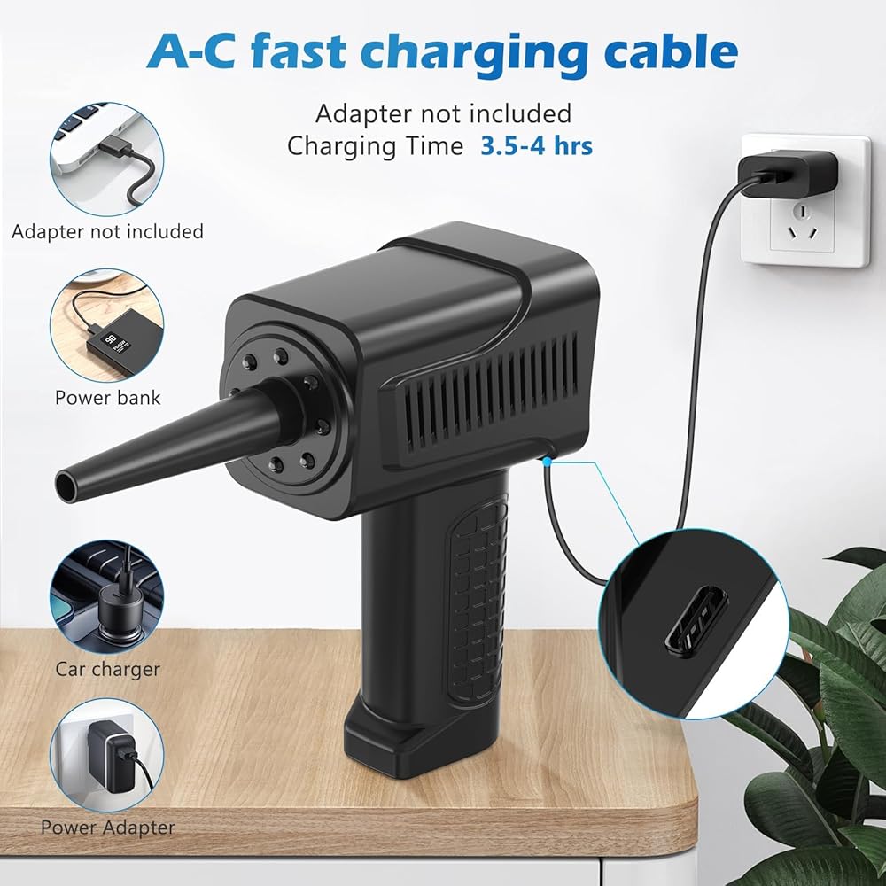 Rechargeable Cordless Air Duster - Rechargeable design,Built in7500 mAh battery, long battery life, Max running time up to 50 minutes. and Fully charged in 2- 3 hours,can be charged by computer, mobile power supply, car charger, adapter.