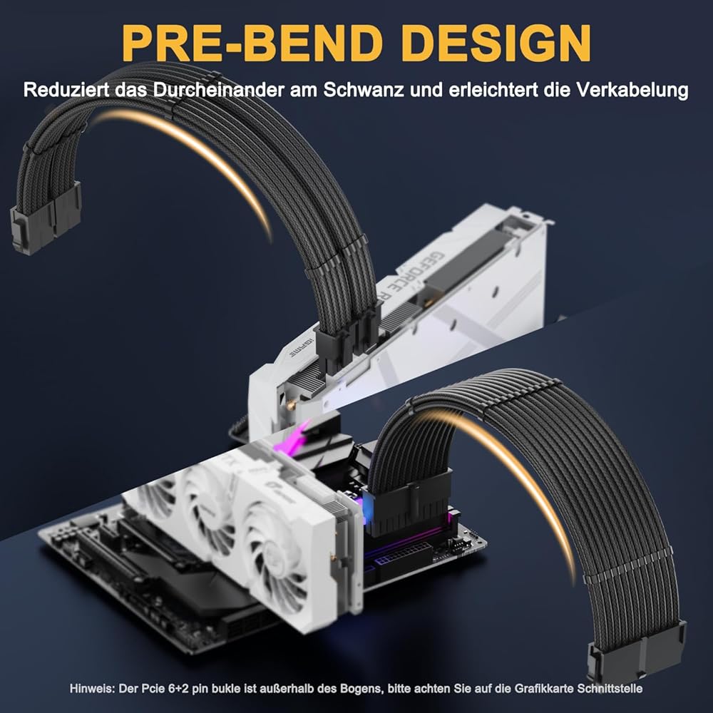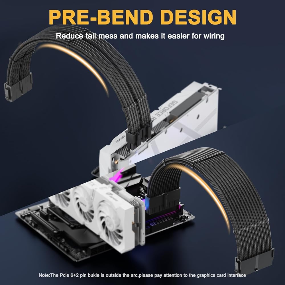 【Unique Pre-bent Design】With the PSU cables having a one-way bend design - long wires on top and shorter ones at the bottom, they ensure ease of bending and routing. These features eliminate cable clutter and make cable management more easy and aesthetically pleasing