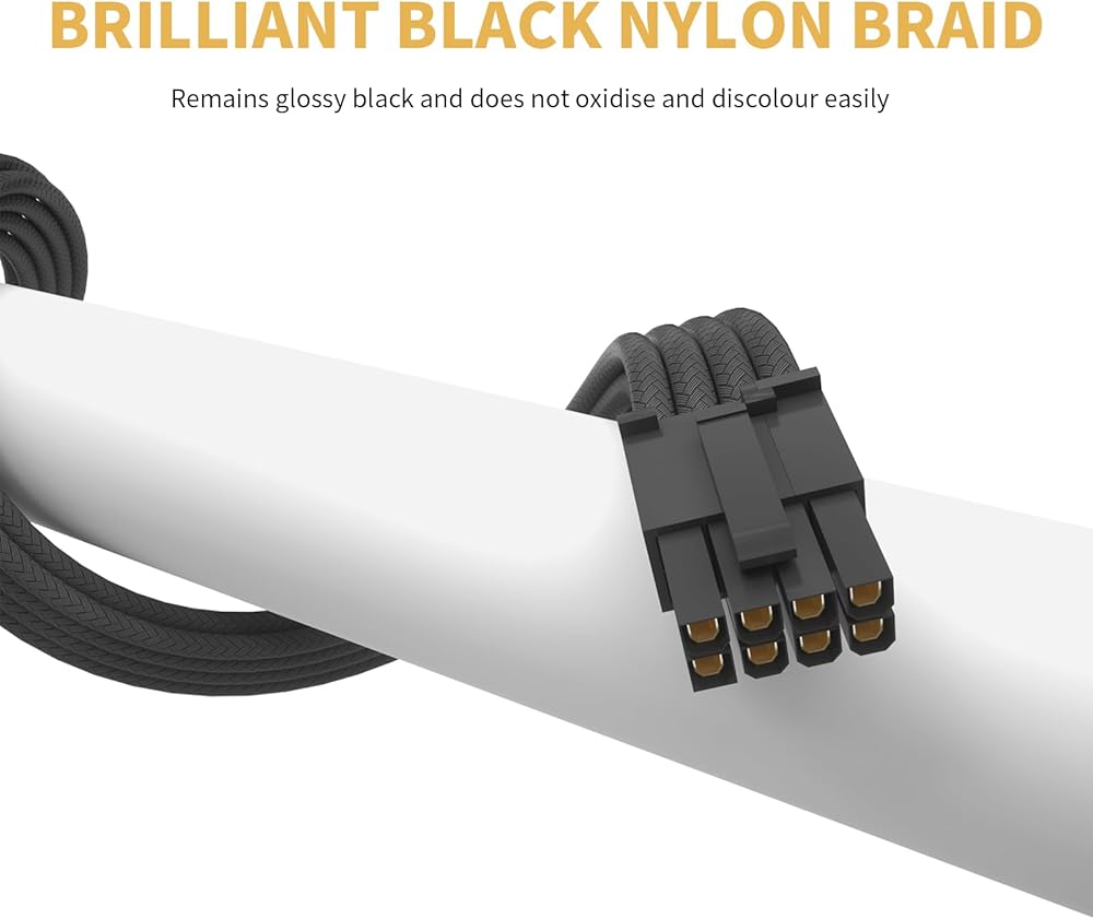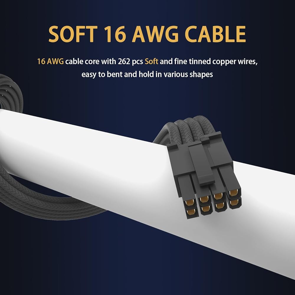 【Gold Plated 8 Pin PCIE Cable】All cables have 16AWG thickened alloy copper core. The 8 pin GPU cable features gold-plated terminals, setting the highest standards in the market. These reduce power loss and heat generation, protecting your graphics card while easily handling the highest voltage power supplies