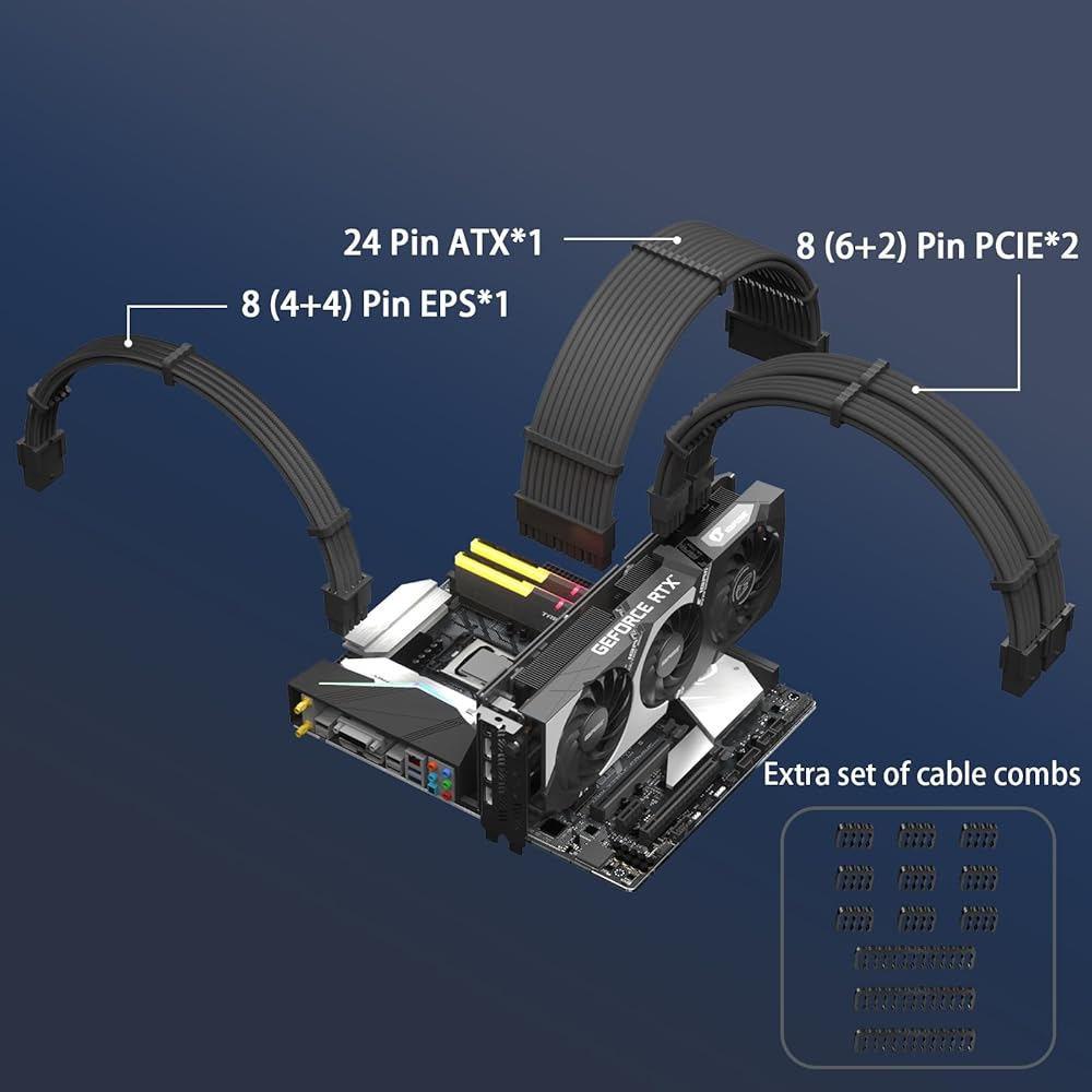 【Pre-installed Cable Comb Design】Each extension cable comes pre-fitted with three transparent cable combs made of PC material for a more refined look. Simply slide the comb's position for hassle-free cable arrangement. An extra set of white cable combs are also provided for customization