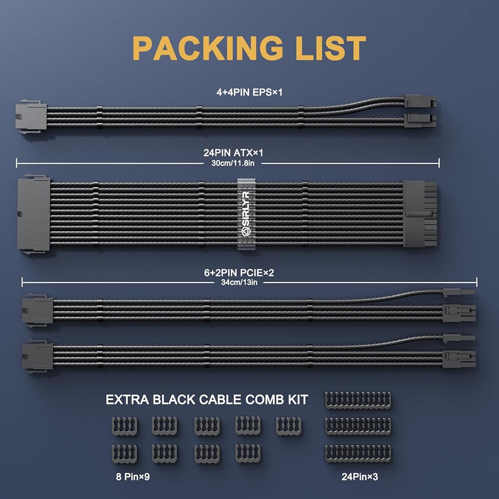 【High-Quality Product and Service】The extension kit includes 1x 24pin motherboard cable, 1x 8pin CPU cables, and 2x 8pin high-performance graphics card power cables, 24pin MB and 8 pin EPS are 30cm/11.8inch long, 8pin GPU extension cables lengthened to 24 cm/13.3 inch to meet the needs of large tower system. Sirlyr is committed to providing top-quality, customized extension cables and PC accessories. With our quality assurance, we offer free replacements within a year for any quality issues
