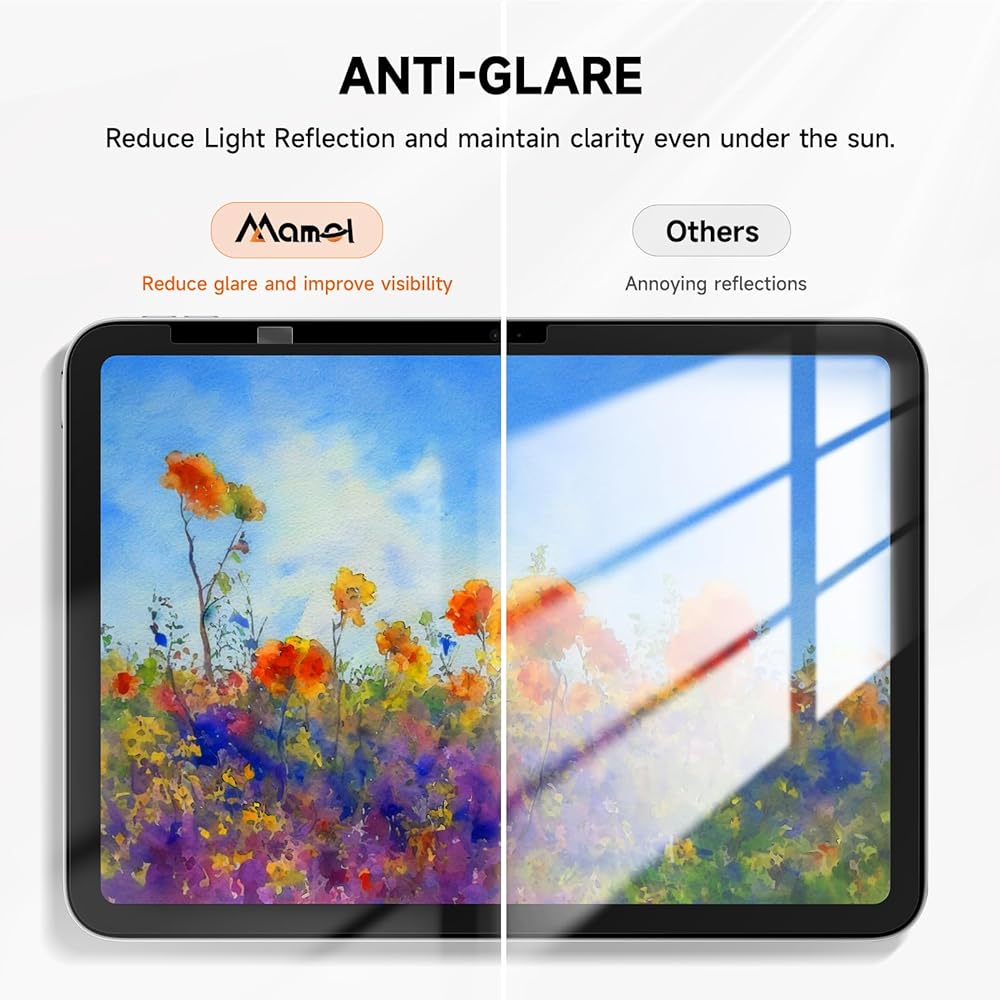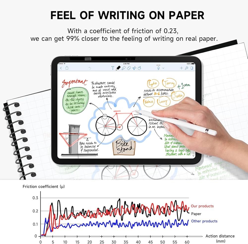 【مثل الكتابة على الورق】 بعد العديد من الاختبارات، وجدنا أن معامل الاحتكاك 0.23 بين القلم وواقي الشاشة هو أقرب شيء موجود لملمس الورق. يستخدم مامول تقنية متقدمة تسمح لنا بالاقتراب بنسبة 90% من الشعور بالكتابة على الورق الحقيقي. عندما نستخدم واقي شاشة iPad هذا في الإنشاء، يمكنك الكتابة والرسم بقدر ما تريد.