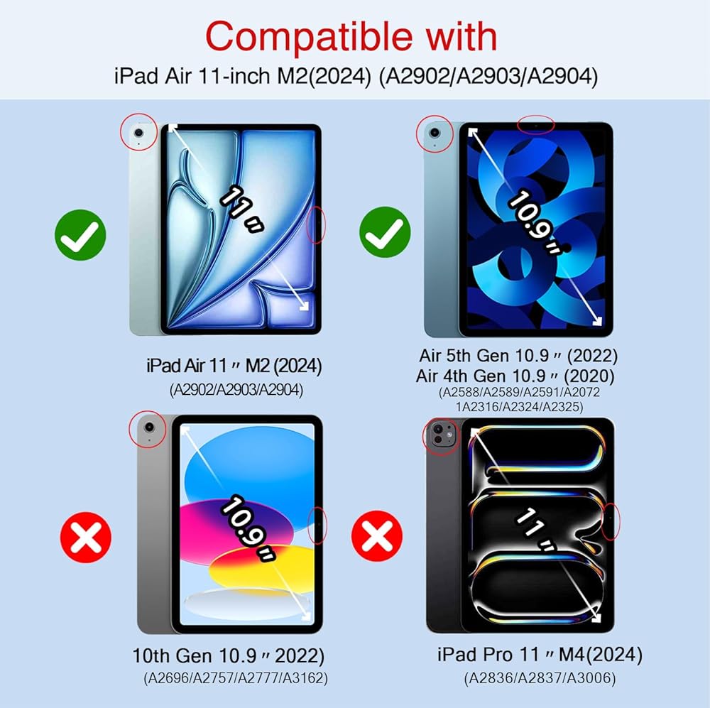 [التوافق] - تم تصميم هذا الجراب حصريًا لجهاز iPad Air 11 بوصة M2 (2024) (رقم الموديل: A2902/A2903/A2904)، iPad Air الجيل الخامس 2022(A2589 A2591 A2588)، وiPad Air الجيل الرابع 2020 (A2316) A2324 A2325 A2072). غير متوافق مع أي أجهزة أخرى.