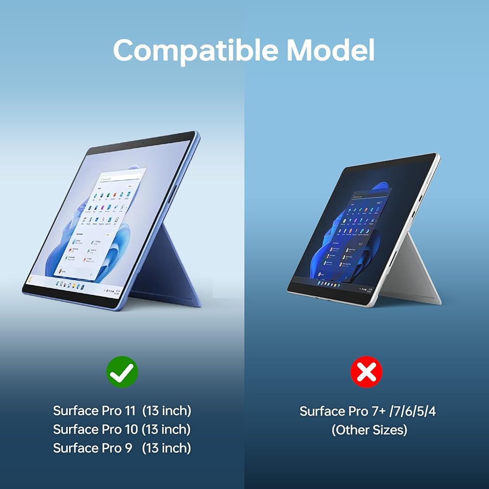 الطرز المتوافقة: مصممة حصريًا لجهاز Microsoft Surface Pro 11 2024 / Surface Pro 10 2024 / Surface Pro 9 2022 مقاس 13 بوصة. لا تناسب أي جهاز لوحي Surface آخر. يرجى التحقق من النموذج الخاص بك في الإعدادات>حول>معلومات النموذج قبل الشراء