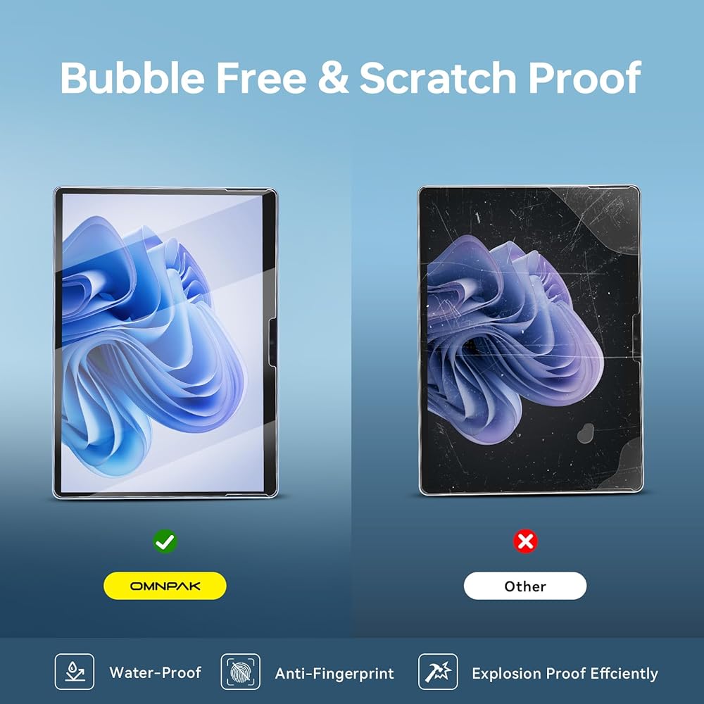 سهولة التركيب: يمكن لواقي الشاشة Omnpak أن يلتصق تلقائيًا بجهاز Microsoft Surface Pro 11/10/9 وتضمن آلية استنفاد الهواء الذاتي تركيبًا خاليًا من الفقاعات