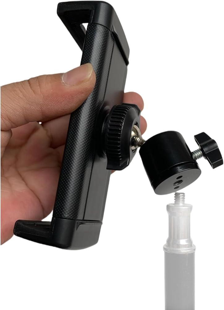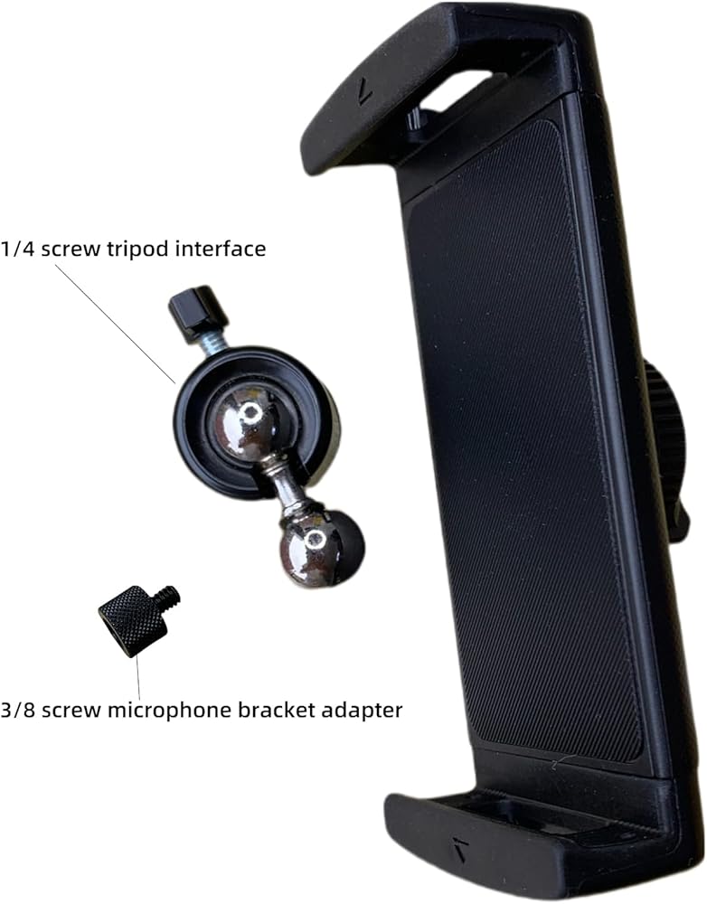 This is a clip for mobile phones and tablets, which can be connected to a tripod with a 1/4 screw interface, a desktop stand with a 17mm ball head interface, and a microphone stand with a 3/8 screw interface. There are three types of interfaces that can be installed according to the user's own needs.