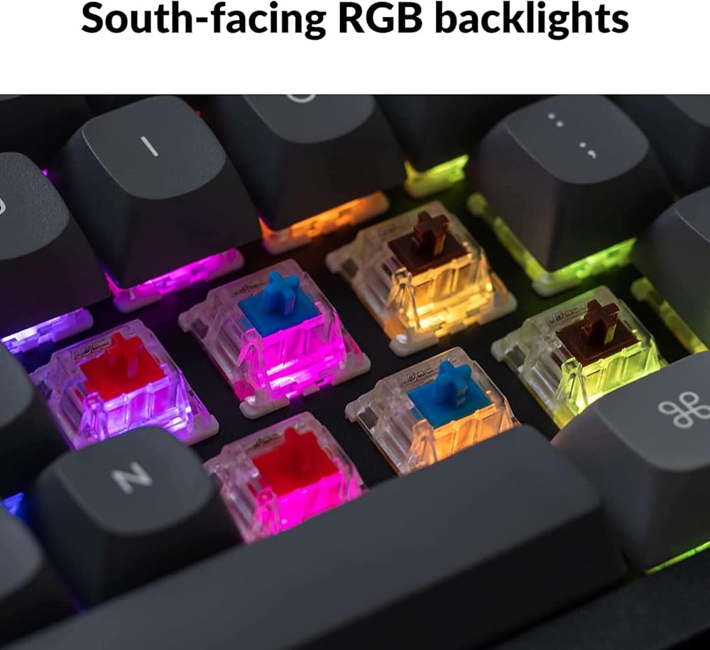 • مصابيح LED RGB مواجهة للجنوب - مصممة لإضاءة الإضاءة الخلفية للوحة المفاتيح بشكل أفضل من زاوية الكاتب مع تثبيت أغطية مفاتيح PBT المتميزة غير اللامعة. كما أن RGB المواجه للجنوب خالٍ من التداخل عندما يقوم المستخدمون بتثبيت أغطية المفاتيح البديلة OEM أو Cherry-profile على لوحة المفاتيح.