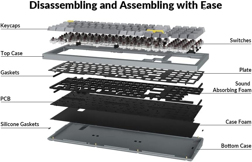 • تصميم مزدوج الحشية - هيكل مبتكر جديد في الصناعة. بالإضافة إلى الحشيات الموجودة على الألواح، أضفنا وسادات سيليكون بين العلب العلوية والسفلية لتقليل رنين الصوت بين المعادن بشكل كبير وتقليل ضوضاء المعادن المتأثرة. يسمح هذا التصميم للوحة المفاتيح بالحفاظ على مرونة هيكل الحشية وتحسين صوت الكتابة بشكل عام.