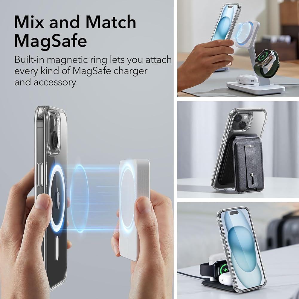 قفل مغناطيسي أقوى: مغناطيسات مدمجة قوية بقوة تثبيت تبلغ 1500 جرام تتيح شحنًا لاسلكيًا أسرع وأسهل في المكان والتنقل وقفل آمن لأي ملحق MagSafe