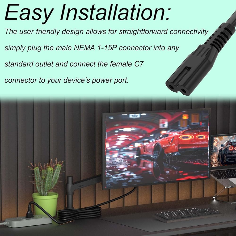 Easy Installation:The user-friendly design allows for straightforward connectivity: simply plug the male NEMA 1-15P connector into any standard outlet and connect the female C7 connector to your device's power port. Enjoy a hassle-free setup for various applications, including home entertainment systems and office setups