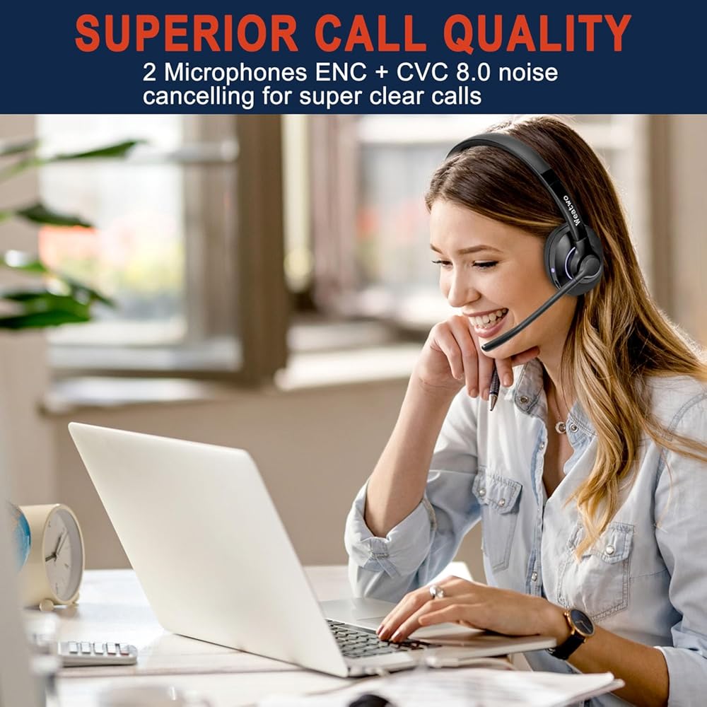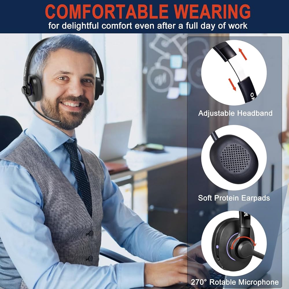 سماعة رأس لاسلكية مع ميكروفونات مزدوجة لإلغاء الضوضاء، سماعة رأس بلوتوث من الفئة 1 مع زر كتم الصوت، وقت التحدث لأكثر من 30 ساعة للعمل المنزلي في المكتب مع الفرق/التكبير/التصغير/الكمبيوتر المحمول والكمبيوتر اللوحي الذكي من Skype