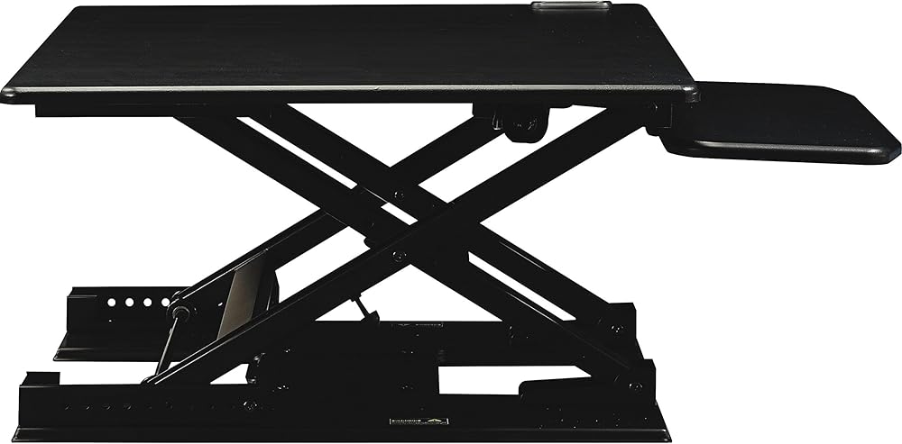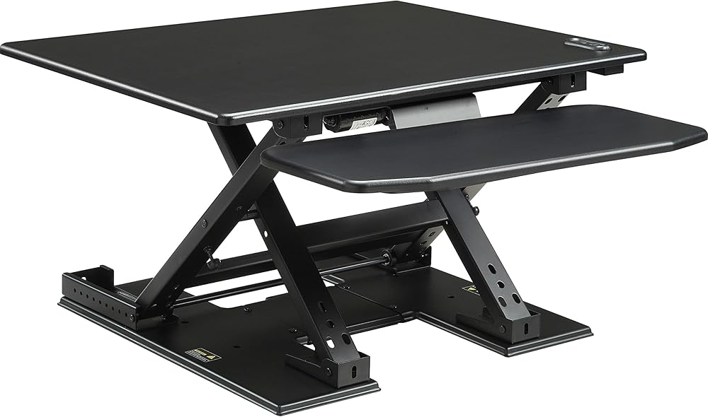 Electric adjustable Height desk riser. Converts any desk into a sit-to-stand work station allowing the user to adjust the workstation from sitting Height to standing Height with the touch of a button. Adjust from 5" to 17.6" above the work surface.