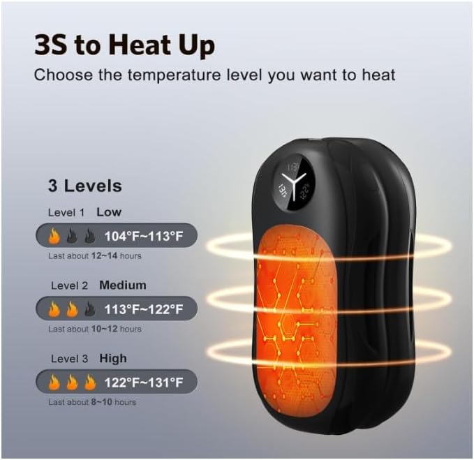 دفء يدوم طويلاً: اعتمد على جهاز تدفئة اليد الخاص بنا لفترات طويلة، مع عمر بطارية يدوم حتى 14 ساعة، سيضمن لك جهاز تدفئة اليد الكهربائي البقاء دافئًا طوال يومك