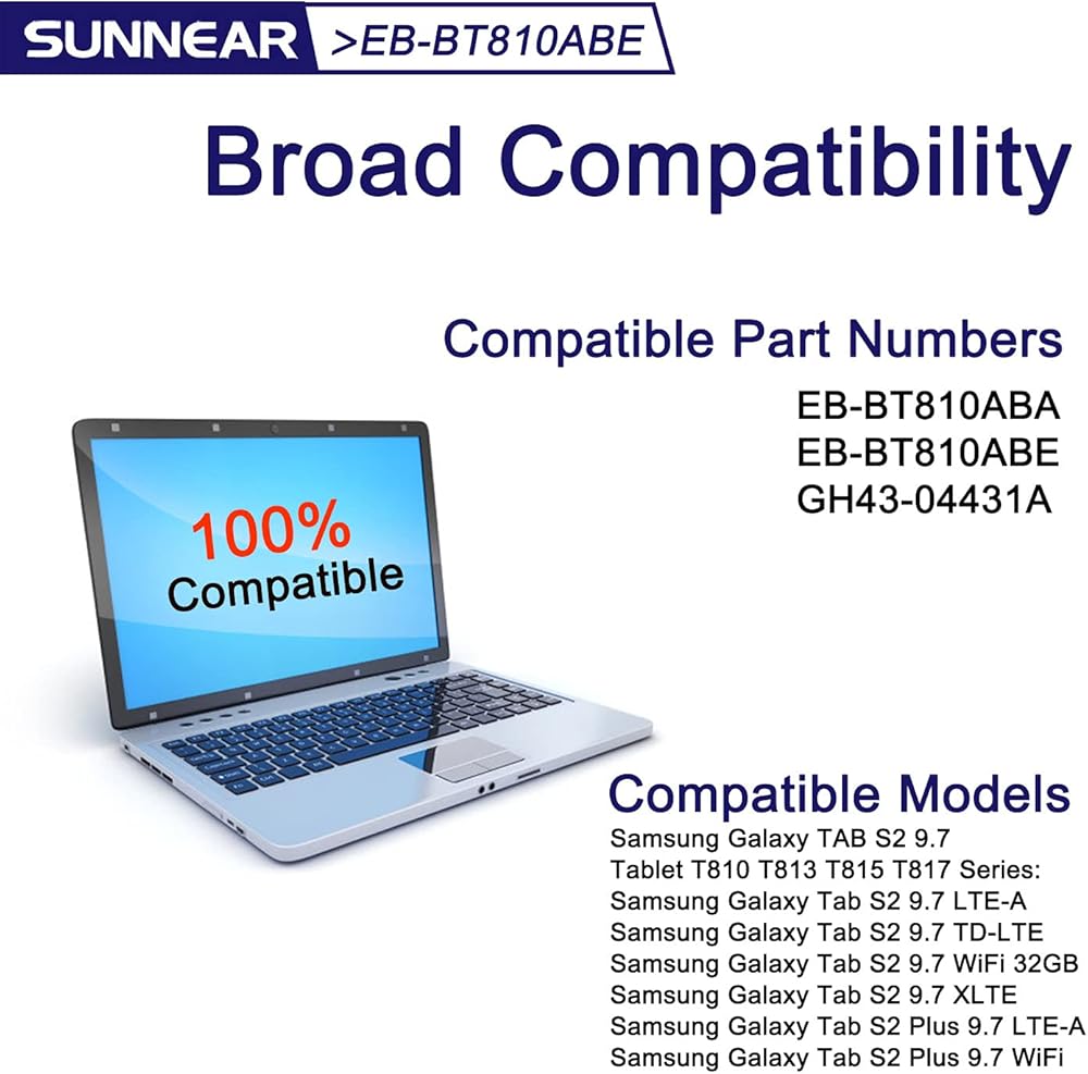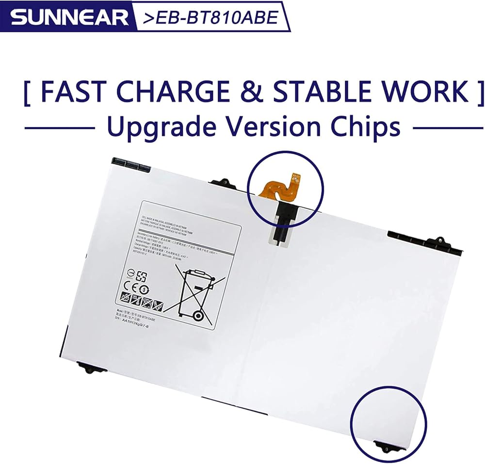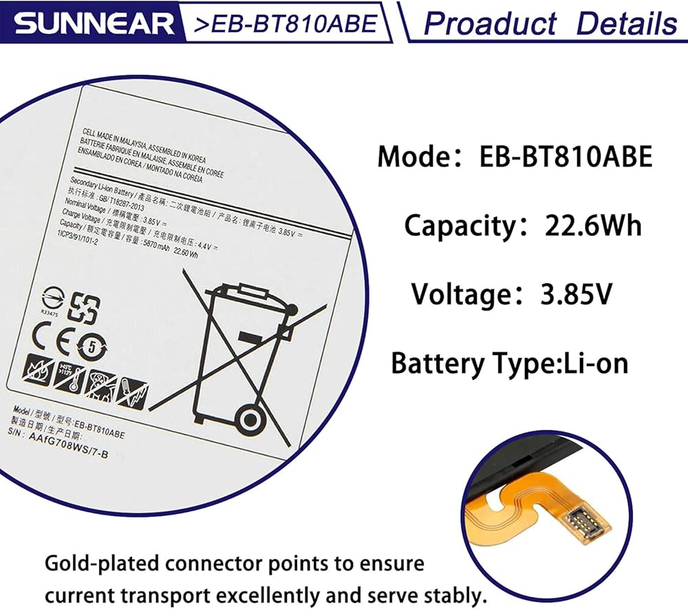 المواصفات: الموديل: EB-BT810ABE الجهد: 3.85 فولت السعة: 5870 مللي أمبير/22.60 وات في الساعة نوع البطارية: ليثيوم أيون. عمر البطارية: ما يصل إلى 500 دورة شحن طوال عمر البطارية. يأتي أيضًا مع أدوات التثبيت
