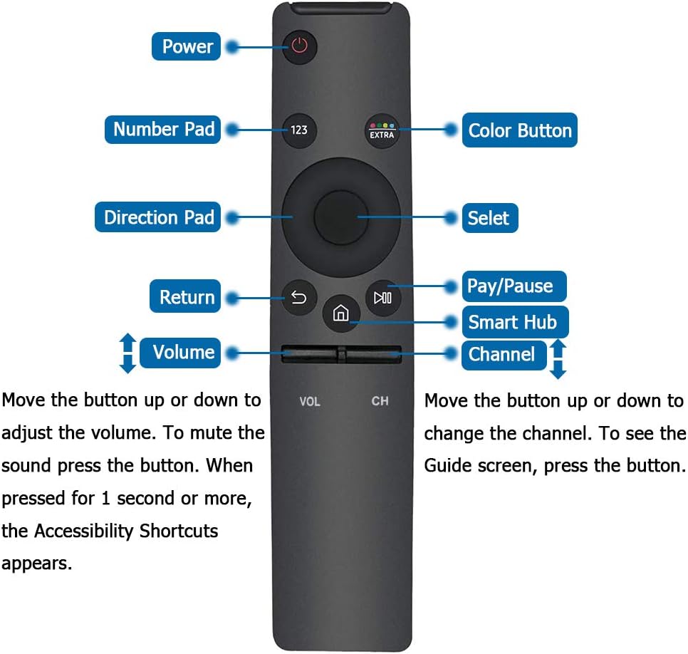 يرجى ملاحظة: محتوى العبوة: 1 * جهاز تحكم عن بعد AZMKIMI. (ليس بلوتوث. لا توجد وظائف صوتية.) 1.VOL (مستوى الصوت): حرك الزر لأعلى أو لأسفل لضبط مستوى الصوت. لكتم الصوت، اضغط على الزر. عند الضغط عليه لمدة ثانية واحدة أو أكثر، تظهر اختصارات إمكانية الوصول؛ 2. CH (القناة): حرك الزر لأعلى أو لأسفل لتغيير القناة. لرؤية شاشة الدليل، اضغط على الزر.