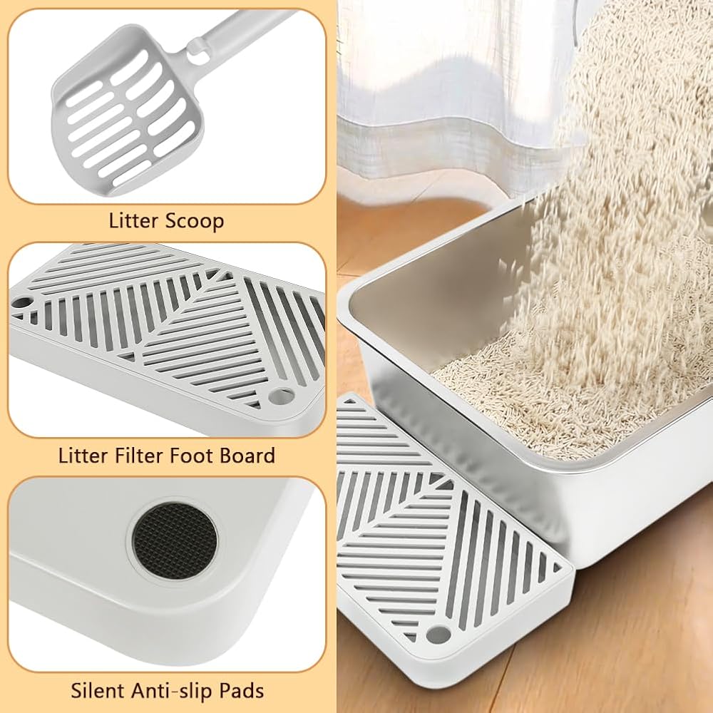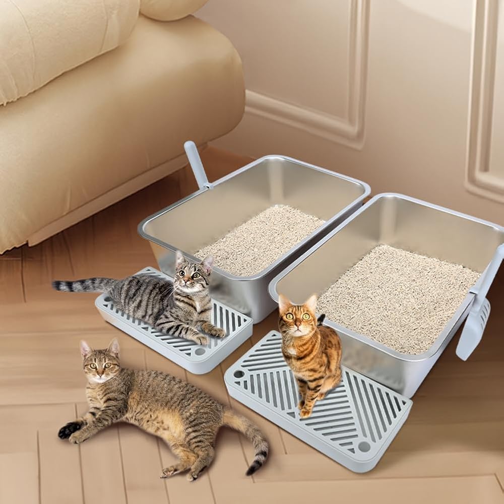 Package Includes: 2 stainless steel litter boxes, 2 litter scoops, 2 foot boards