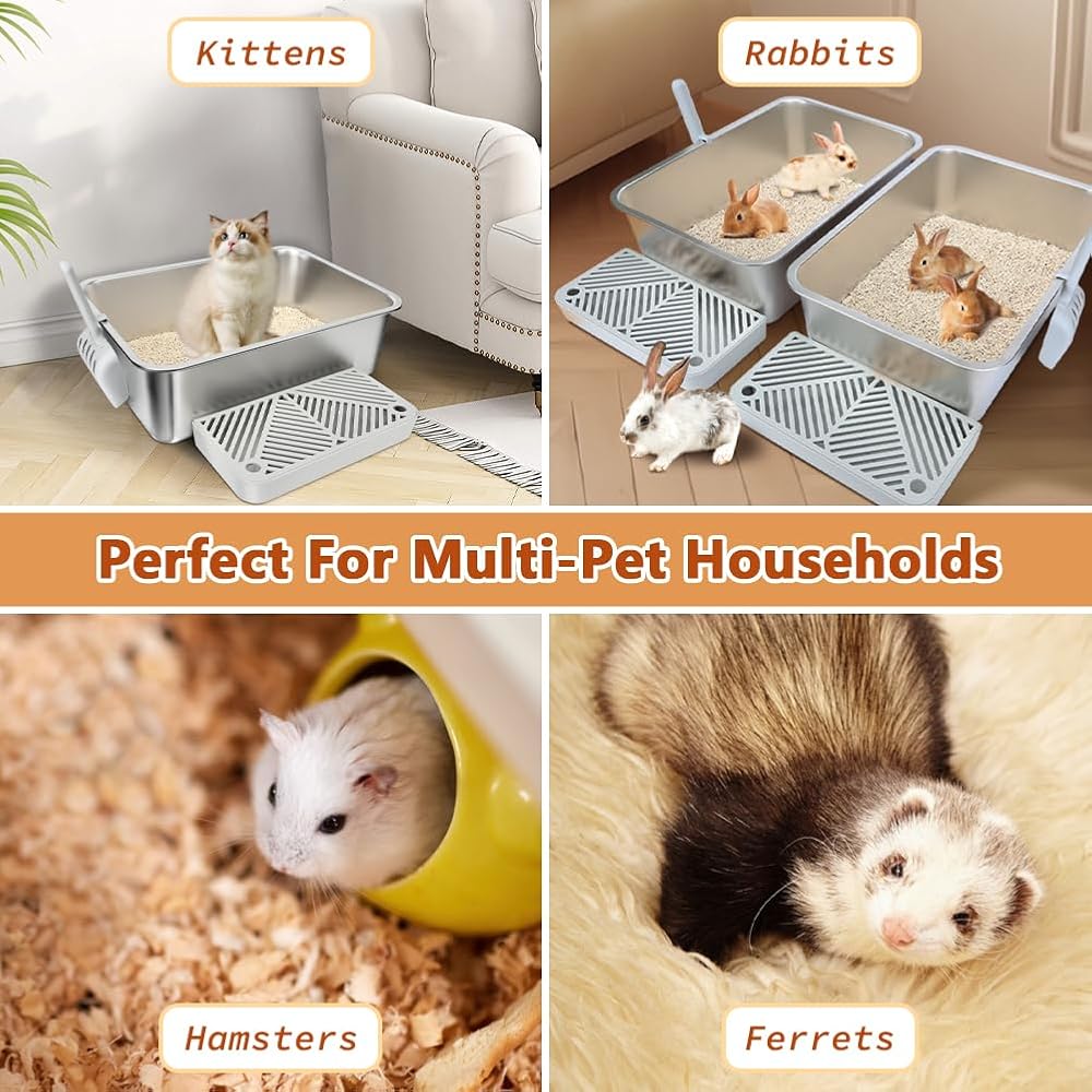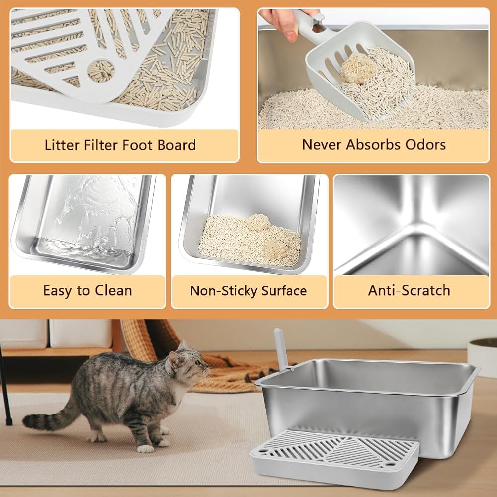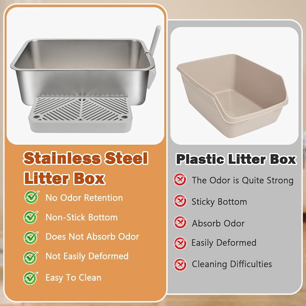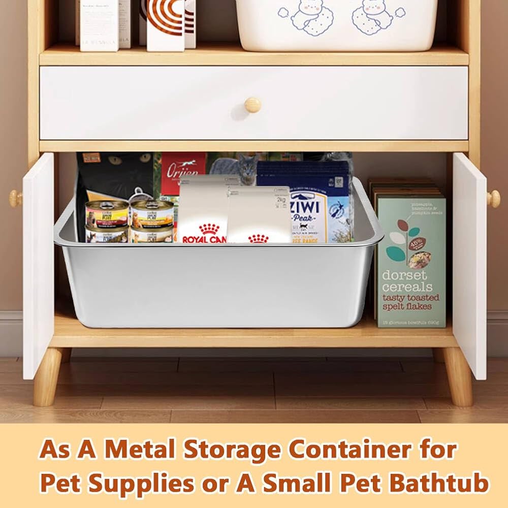 1. Durable Construction: This stainless steel kitty litter box is crafted from high-quality, thick stainless steel, built to withstand daily use while offering excellent rust and scratch resistance. Its sturdy construction provides a clean, safe, and long-lasting environment for your cat, ensuring it maintains superior quality even with long-term use