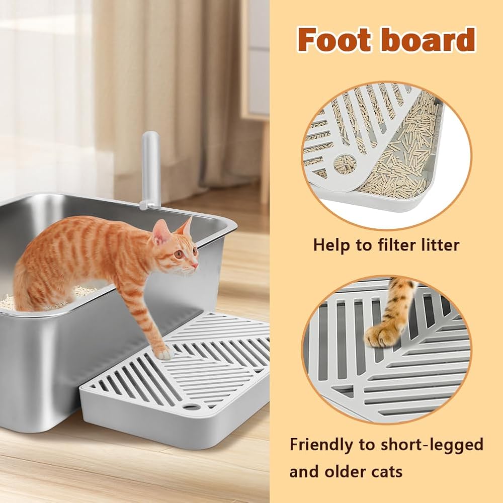 3.Thoughtful User-Centered Design: The specially designed footboards offer convenient access for senior cats or cats with short legs, ensuring they can comfortably use the litter box without strain or fatigue. The included sturdy litter scoop makes cleaning even easier, reducing the hassle of daily maintenance and providing great convenience for busy pet owners